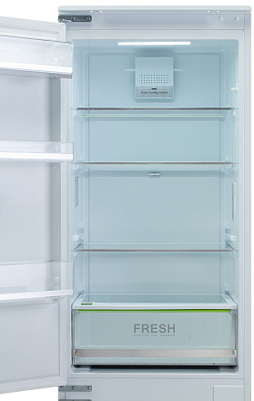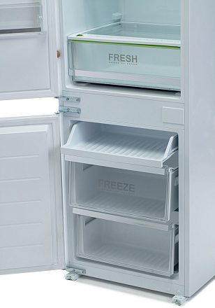 Экономичная модель (класс A+) с технологией No Frost. Полезный объем 247 л (180 л холодильное + 67 л морозильное отделение). Светодиодное освещение, 4 полки и специальный бокс для овощей/фруктов. Функция суперзаморозки. Автономное сохранение холода до 10 часов при отключении электроэнергии.