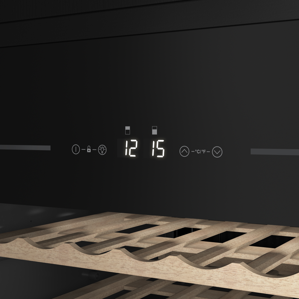 Модель оснащена системой двойных климатических зон, позволяющих одновременно хранить красные и белые вина при оптимальных для каждого типа температурах. Диапазон температурного регулирования от 5 до 20℃ обеспечивает точные настройки под различные сорта вин. Электронная панель управления с внешним дисплеем обеспечивает удобный контроль параметров без необходимости открывания дверцы.