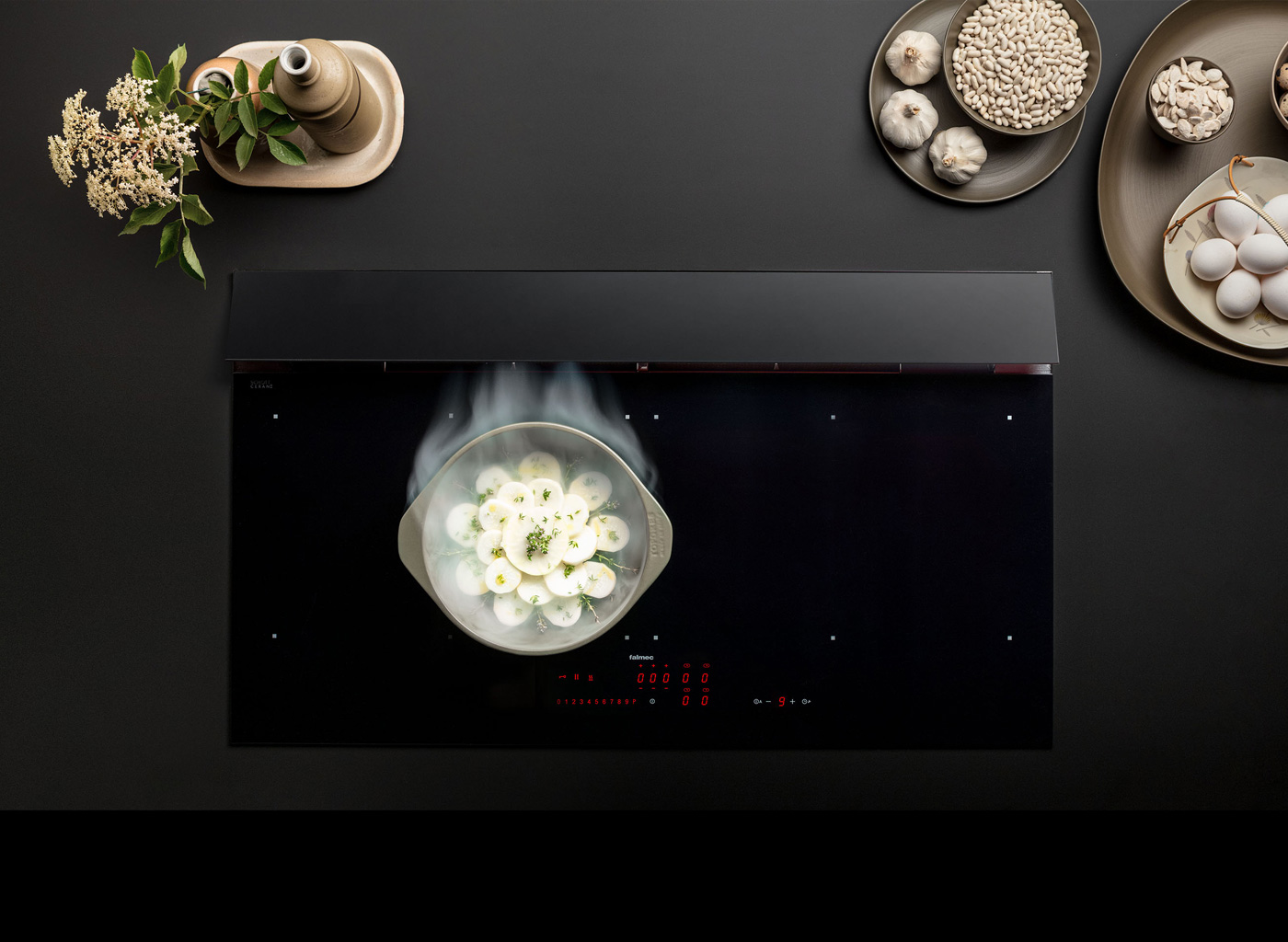 Итальянская варочная панель со встроенной вытяжкой из черного стекла. Современный дизайн, подходящий для любого интерьера кухни.