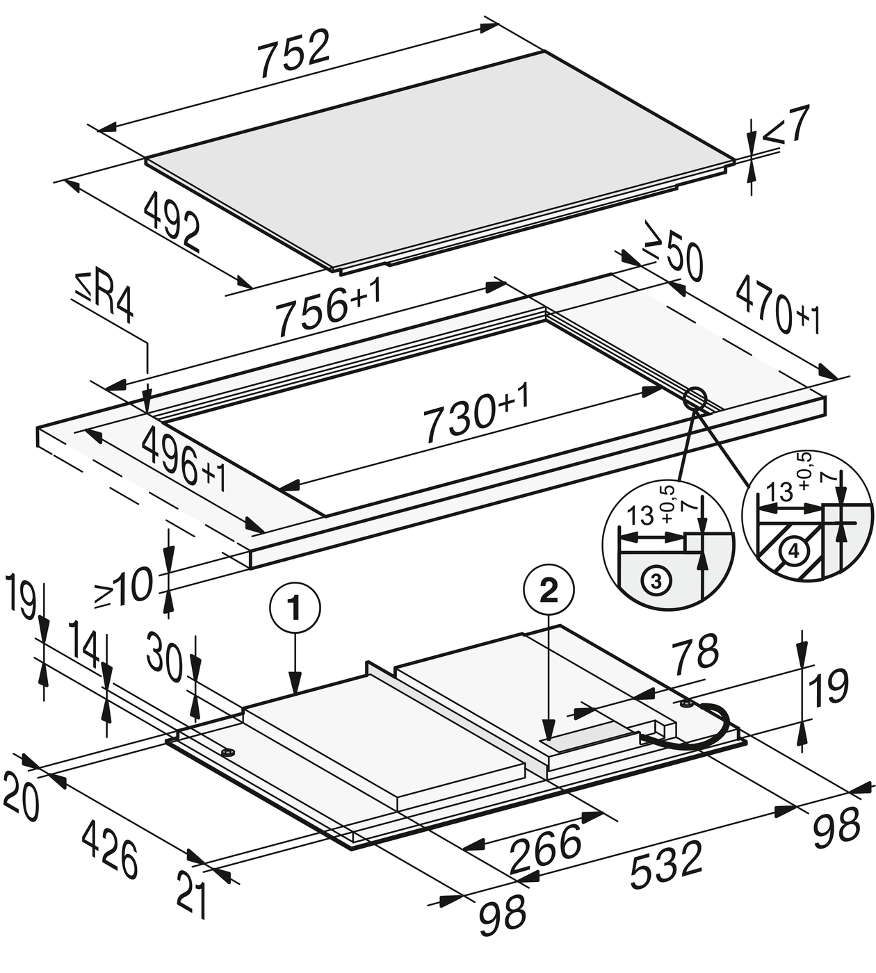Размер ниши(Ш x Г): 730/756 x 470/479 (только заподлицо, вырез ступенькой) мм