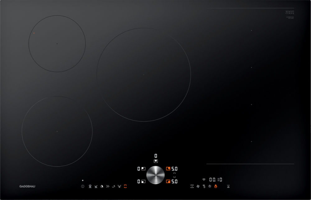 2 комбинируемые индукционные конфорки 19 × 21 см (2200 Вт, с функцией Booster 3700 Вт), при совмещении 38 × 21 см (3300 Вт, с функцией Booster 3700 Вт).