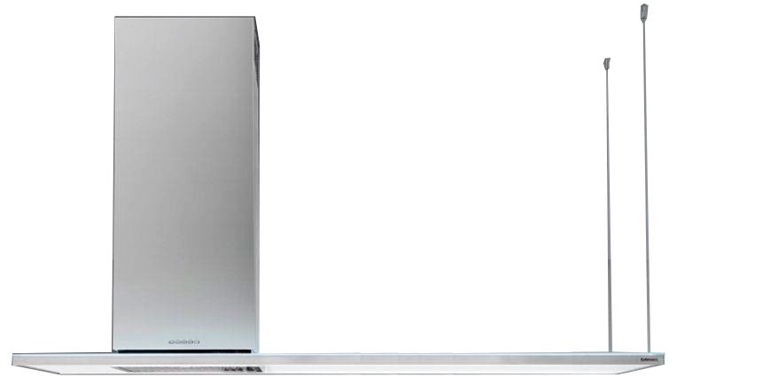 Островная вытяжка в стиле минимализма с белой матовой поверхностью и плавными линиями.