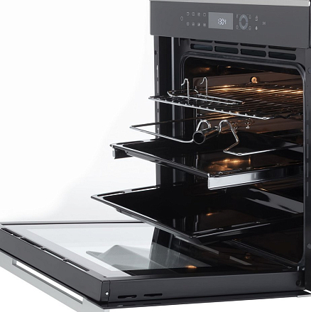 Духовой шкаф BM 60.3 с тройным остеклением дверцы для безопасности. Сенсорная панель управления включает два утапливаемых переключателя, обеспечивая надежность и точность настроек. 10 режимов работы включают ЭКО, гриль с конвекцией и Multi-Cooking. Доводчик мягкого закрытия и телескопические направляющие повышают удобство. Функции размораживания и памяти упрощают процесс готовки. Таймер с отложенным запуском и подсветка камеры делают использование комфортным. Защита от детей и двойная циркуляционная система охлаждения обеспечивают безопасность. Полезный объем 73 л и 5 уровней приготовления идеальны для большой семьи.
