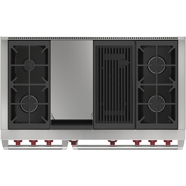 Газовая варочная поверхность состоит из четырёх горелок, мощностью от 2,7 кВ (для топления) до 5,3 кВ (для быстрого закипания и интенсивной обжарки) . Запатентованная двухуровневая конструкция газовой конфорки Wolf позволяет максимально точно контролировать температуру нагрева. Система искрового реподжига автоматически зажигает горелку при её заливе.