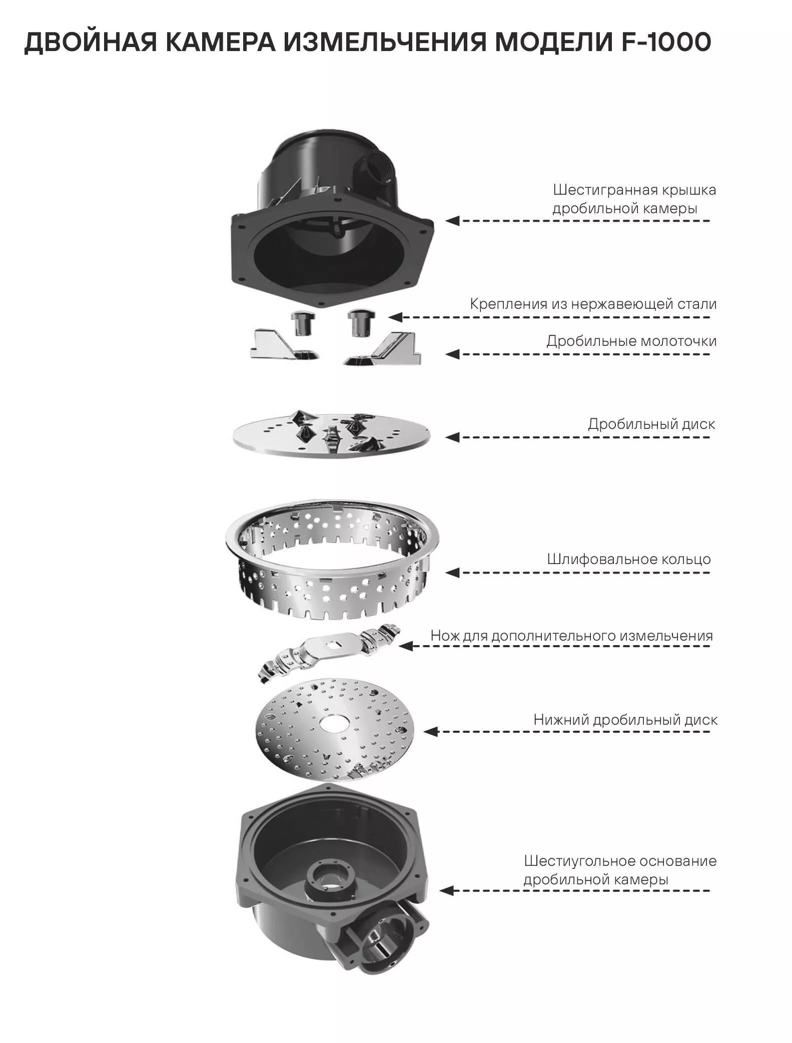 Измельчитель Paulmark FISSION F-1000 оснащен двойной пятиступенчатой системой измельчения, которая эффективно перерабатывает даже волокнистые отходы в мельчайшую фракцию, безопасную для системы водоотведения. Благодаря инновационной конструкции дробильного диска, двойному кожуху двигателя из алюминиевого сплава и шумоизоляции корпуса уровень шума снижен до комфортных 62 дБ.