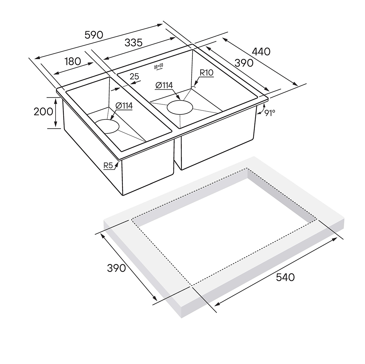 Габариты мойки составляют 590х440 мм, а дополнительная чаша шириной 180 мм расширяет функционал. Возможен подстольный, накладной монтаж или монтаж вровень со столешницей.