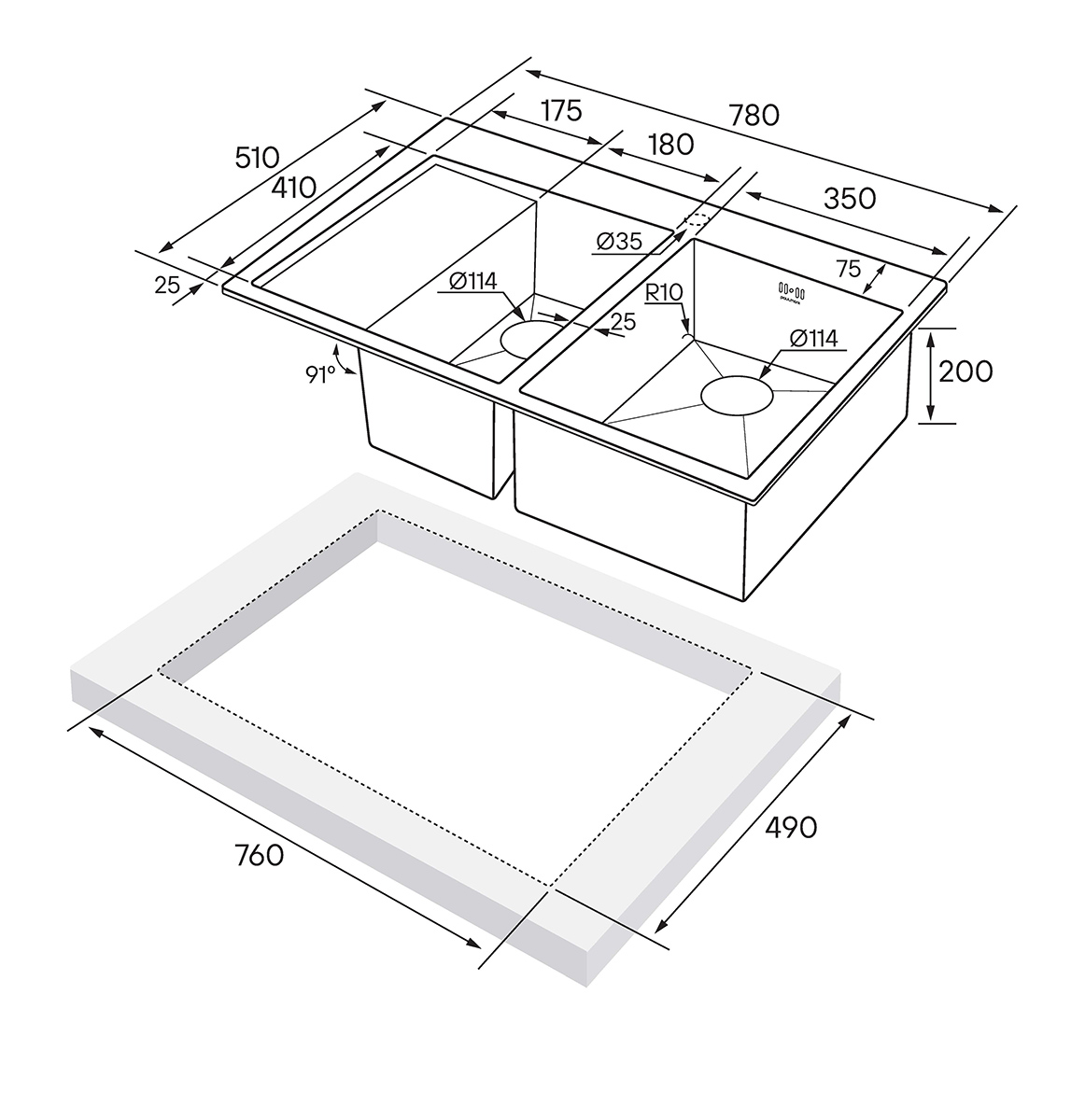 - Комплект крепежей для врезного монтажа; - Отводная арматура (слив-перелив); - Сифон бутылочного типа с подключением посудомоечной машины (ПММ).