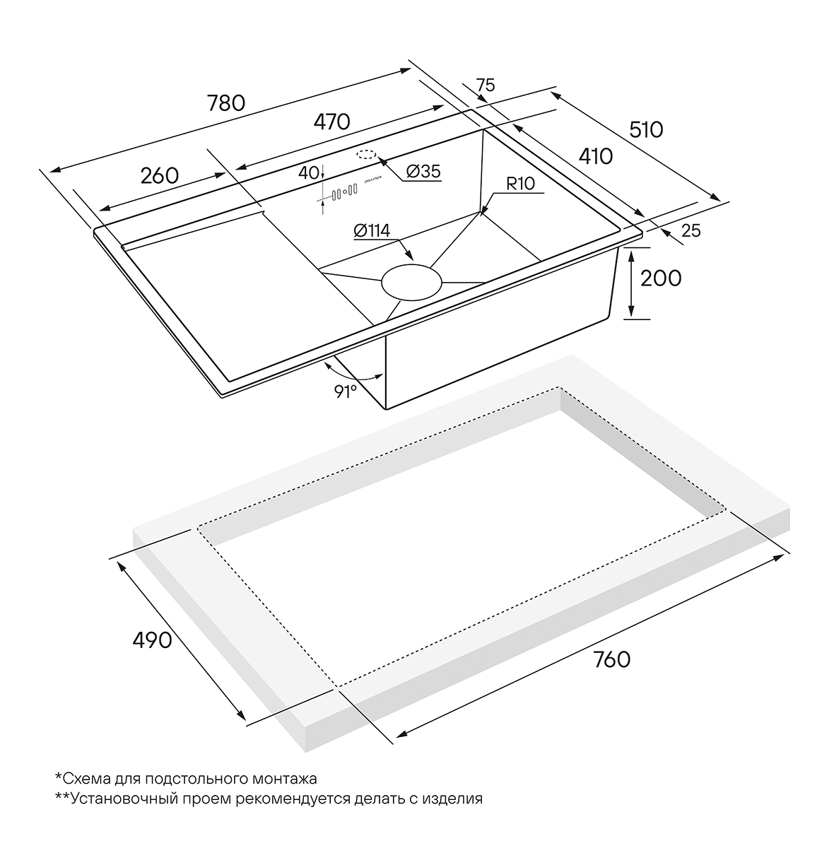 - Комплект крепежей для врезного монтажа; - Отводная арматура (слив-перелив); - Сифон бутылочного типа с подключением посудомоечной машины (ПММ).