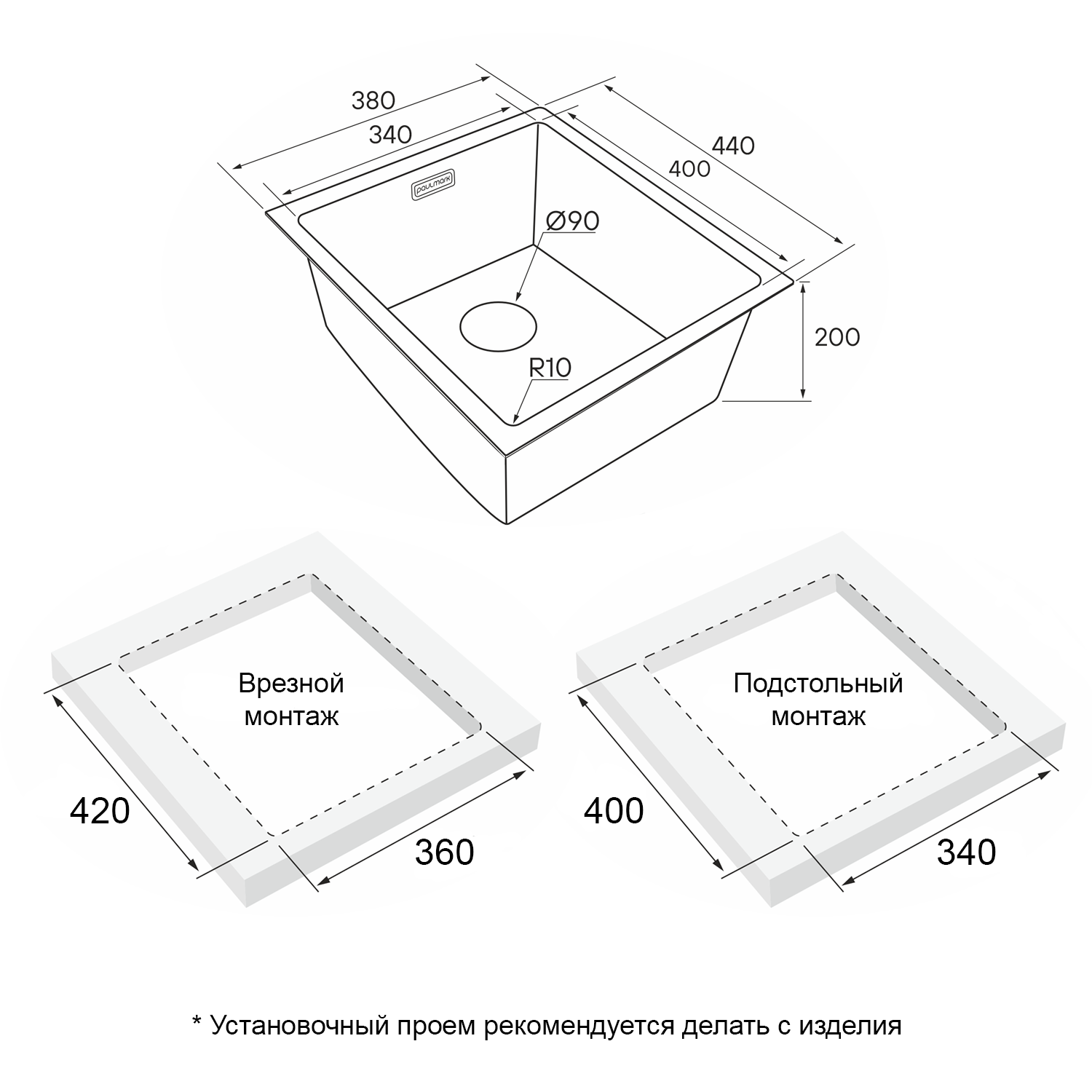 - Комплект крепежей для врезного монтажа; - Комплект для подстольного монтажа; - Отводная арматура (слив-перелив); - Сифон бутылочного типа с подключением посудомоечной машины (ПММ).