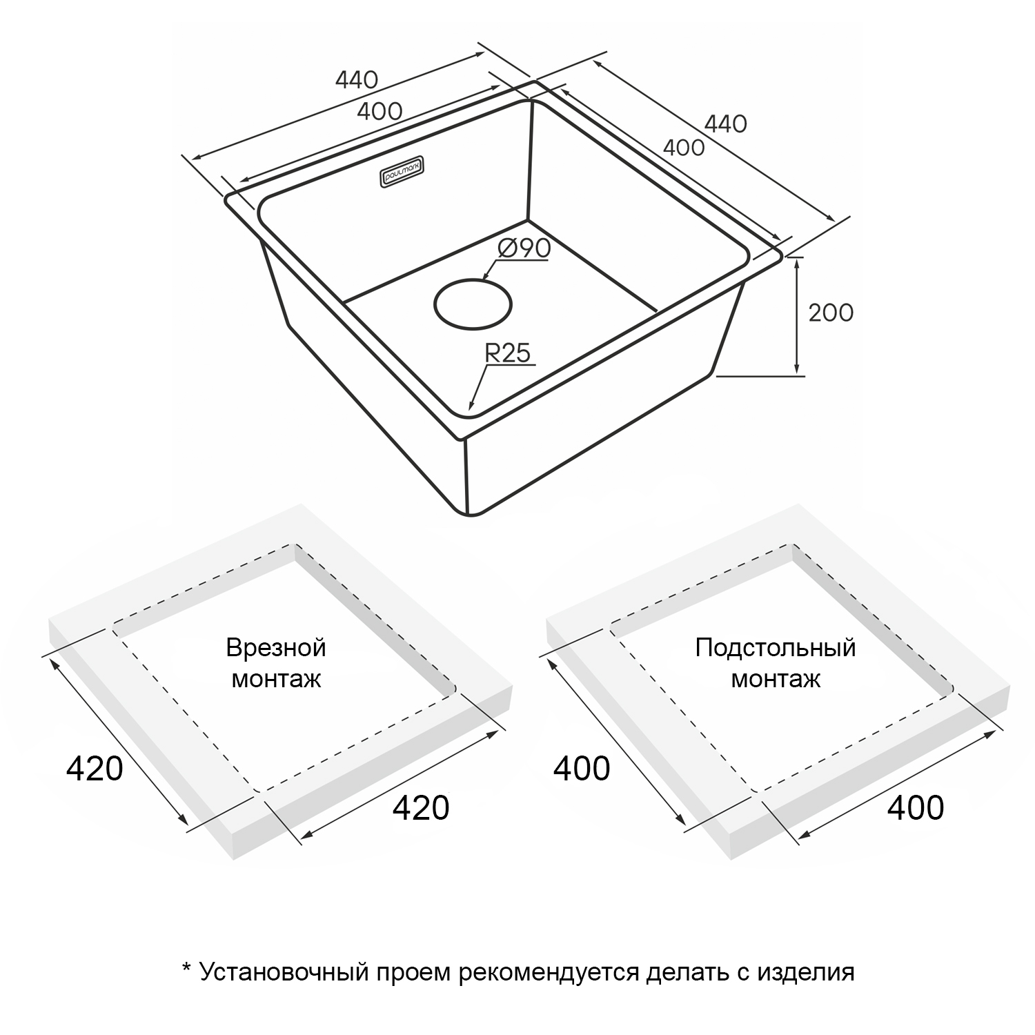 Мойки YUNI UNI могут быть установлены как врезным способом поверх столешницы, так и под столешницу (подстольный монтаж).