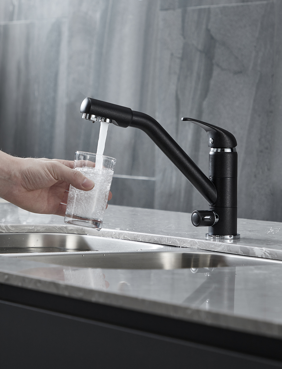 предусматривает поступление фильтрованной воды, которая не смешивается с водопроводной. Питьевая вода подается через отдельные трубку и аэратор, а для регулирования питьевой воды предусмотрена отдельная ручка.
