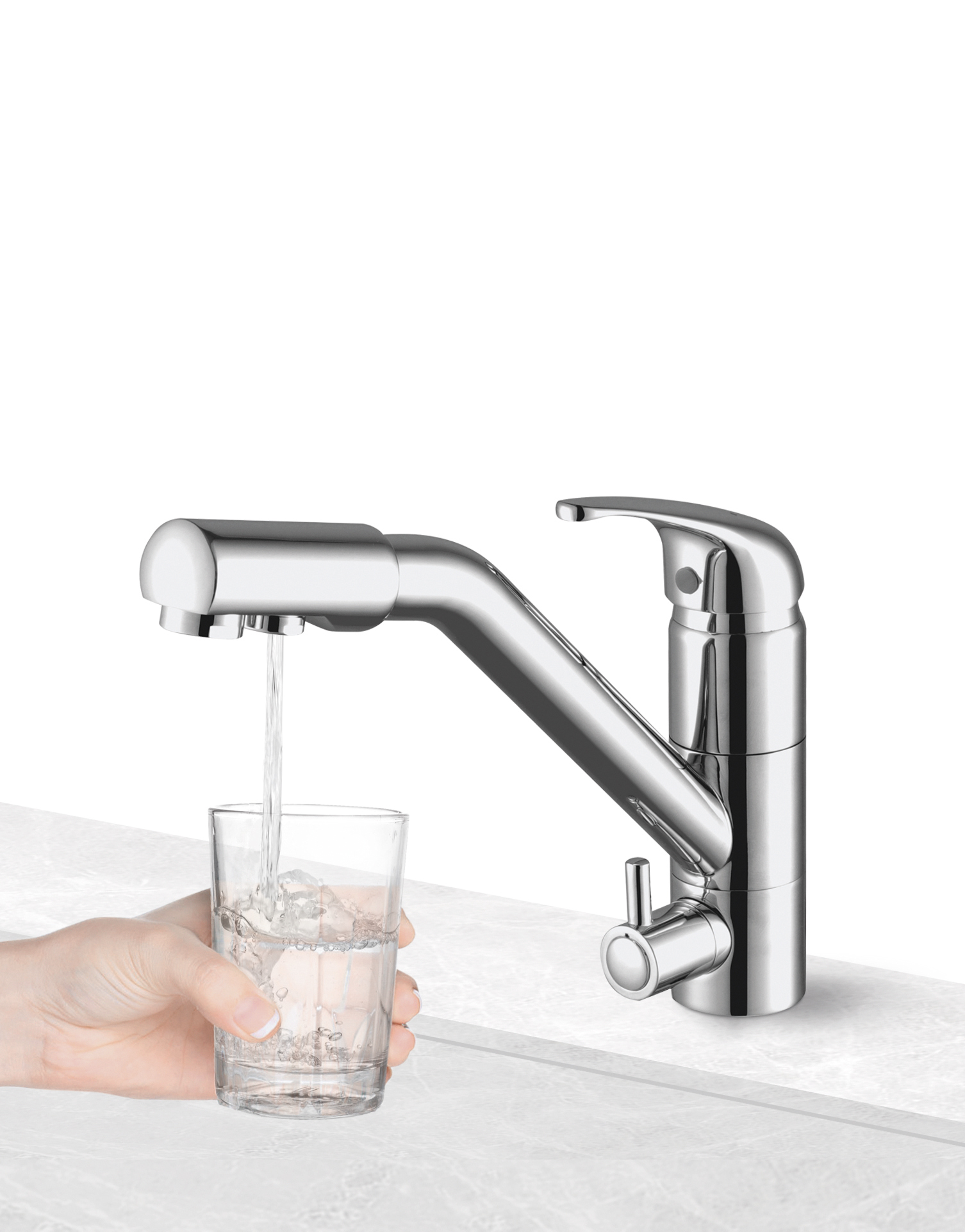 предусматривает поступление фильтрованной воды, которая не смешивается с водопроводной. Питьевая вода подается через отдельные трубку и аэратор, а для регулирования питьевой воды предусмотрена отдельная ручка.