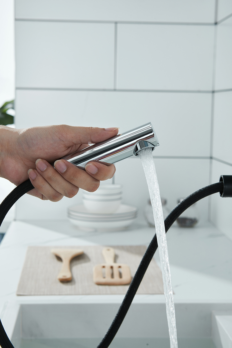 Конструкция смесителя с вытяжным шлангом значительно облегчает процесс мойки посуды или продуктов любого размера и формы.