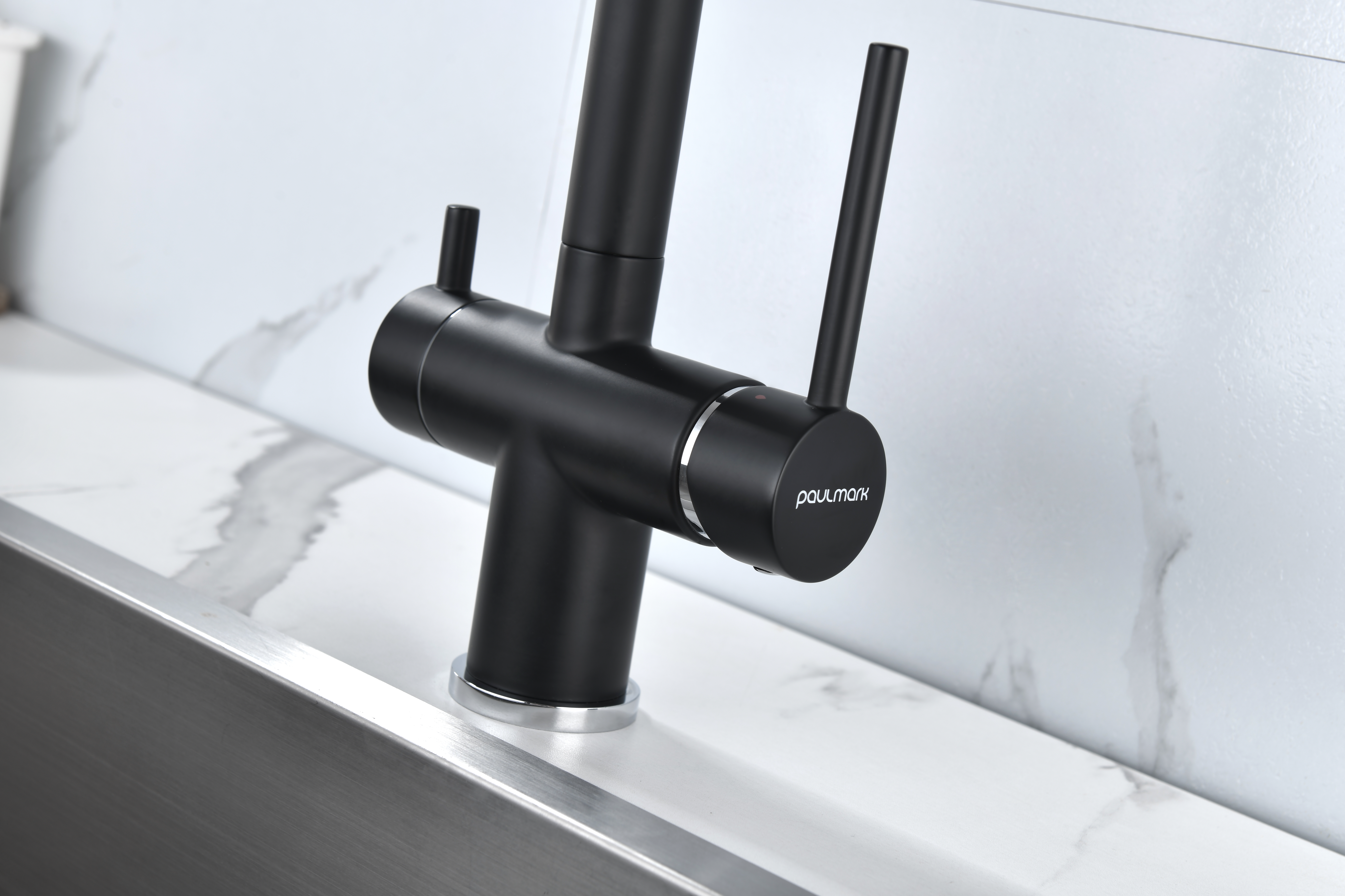 SERPENTINE оснащён функцией TRINKWASSER - излив смесителя имеет встроенный независимый канал для питьевой воды из фильтра, таким образом питьевая и водопроводная вода не смешиваются. Управление питьевой водой осуществляется отдельным рычагом, расположенным слева. Для пуска водопроводной воды используется большой рычаг справа.