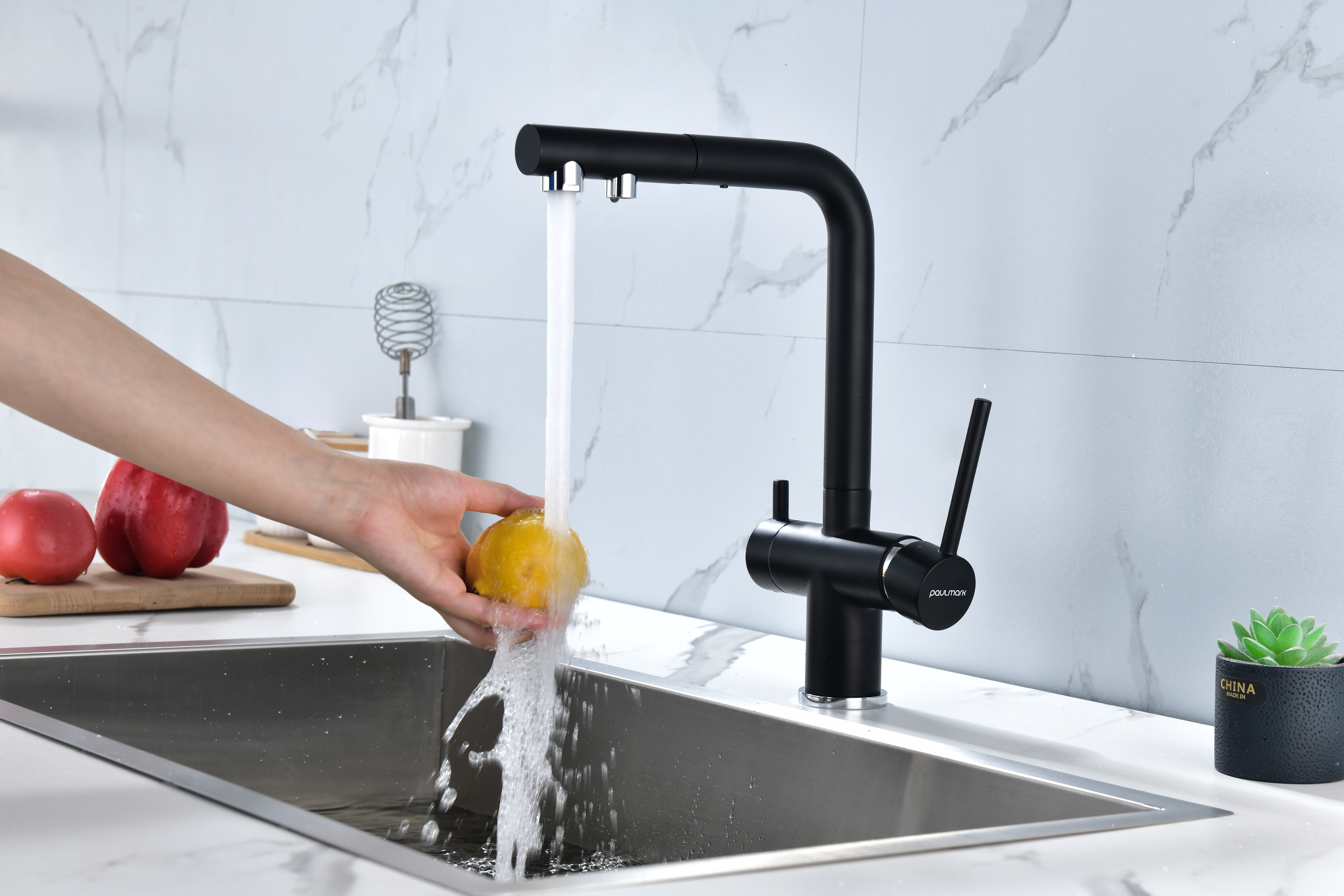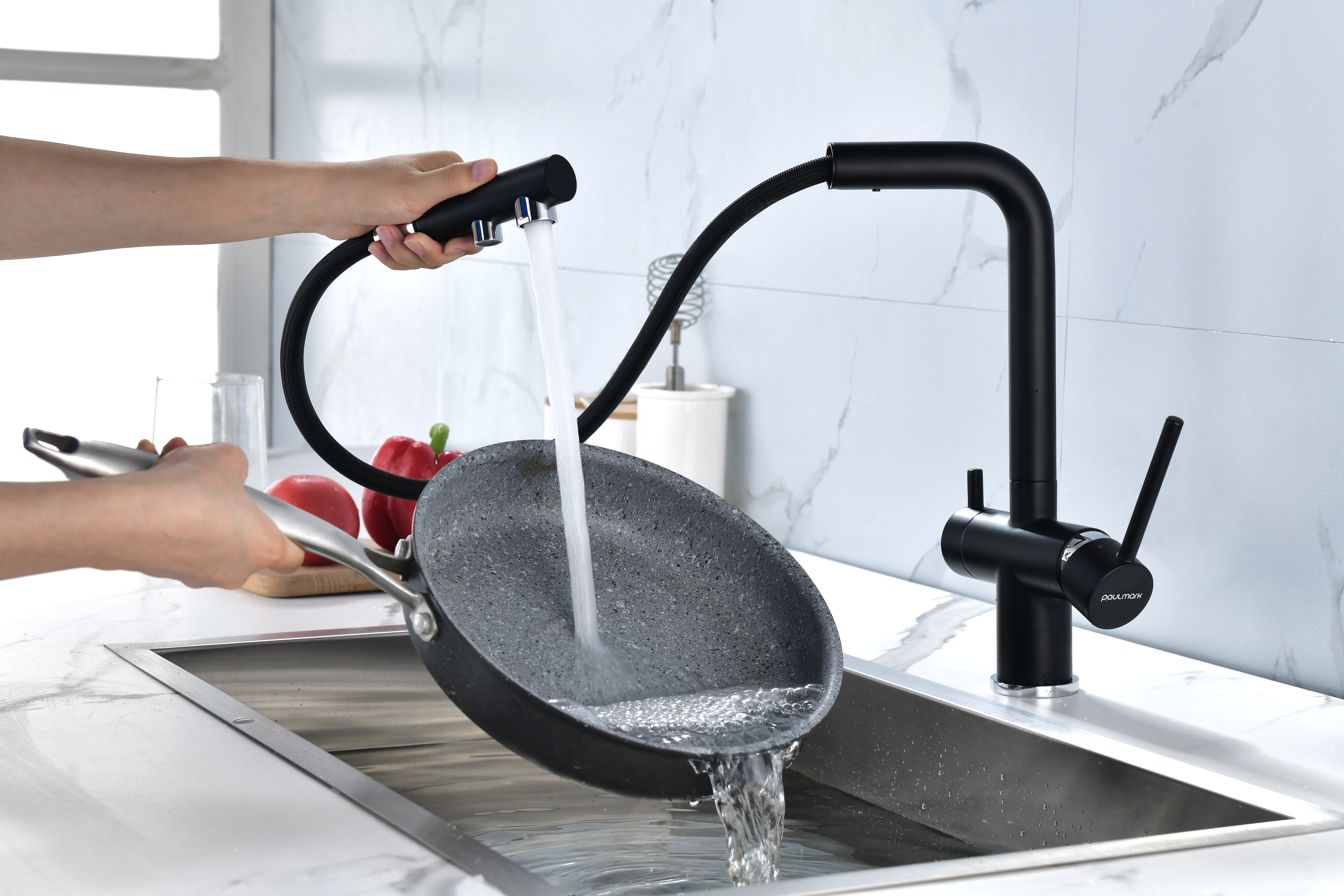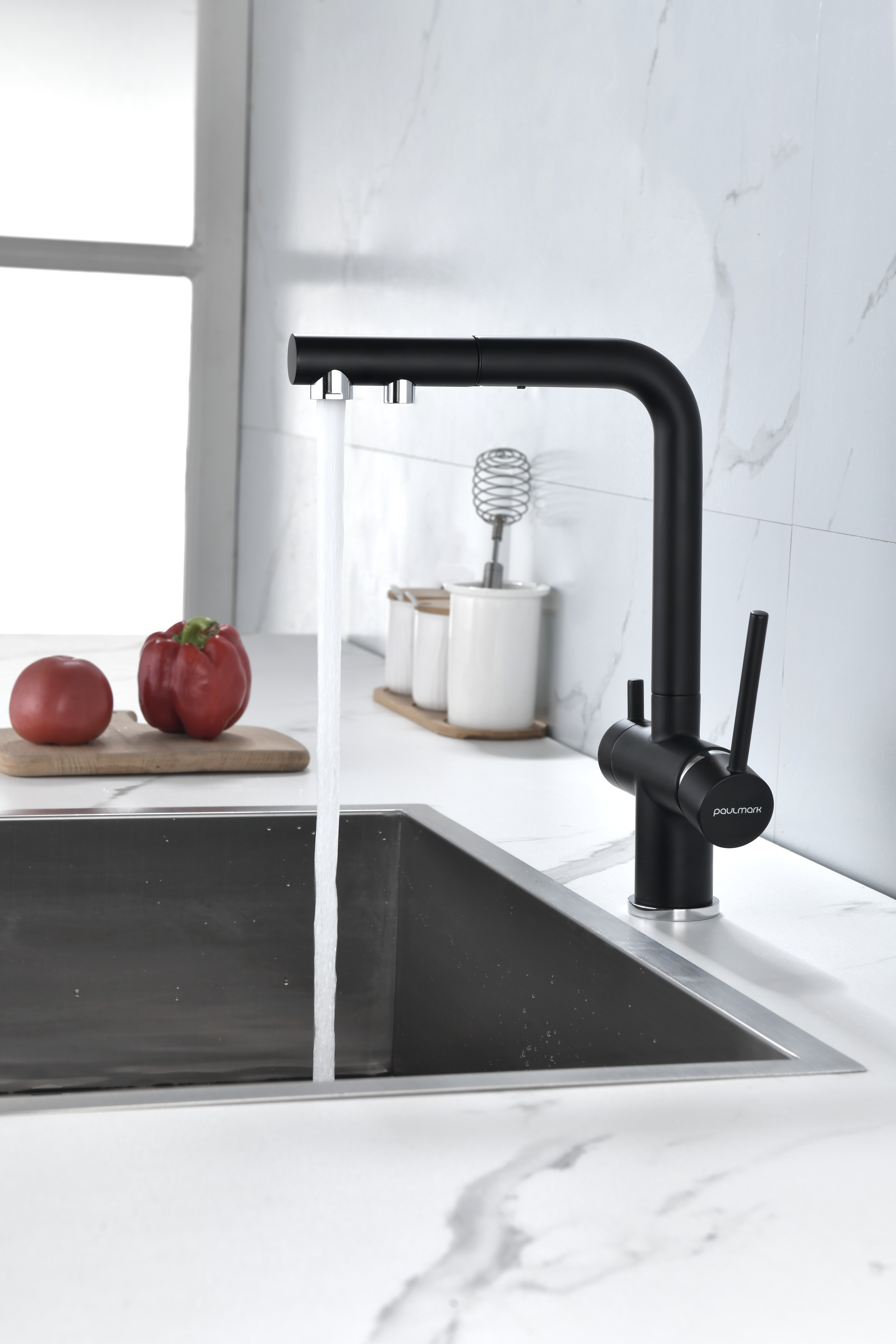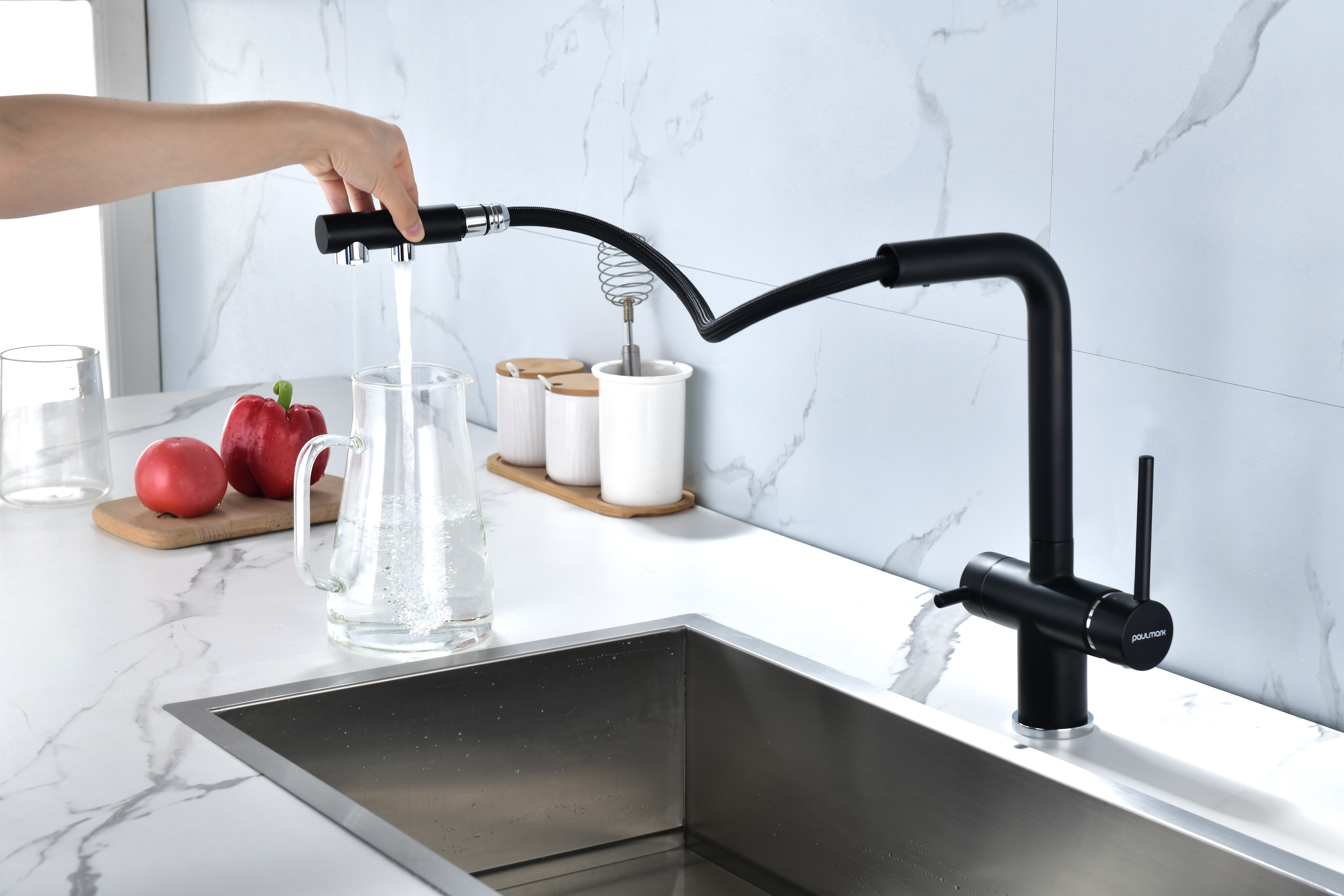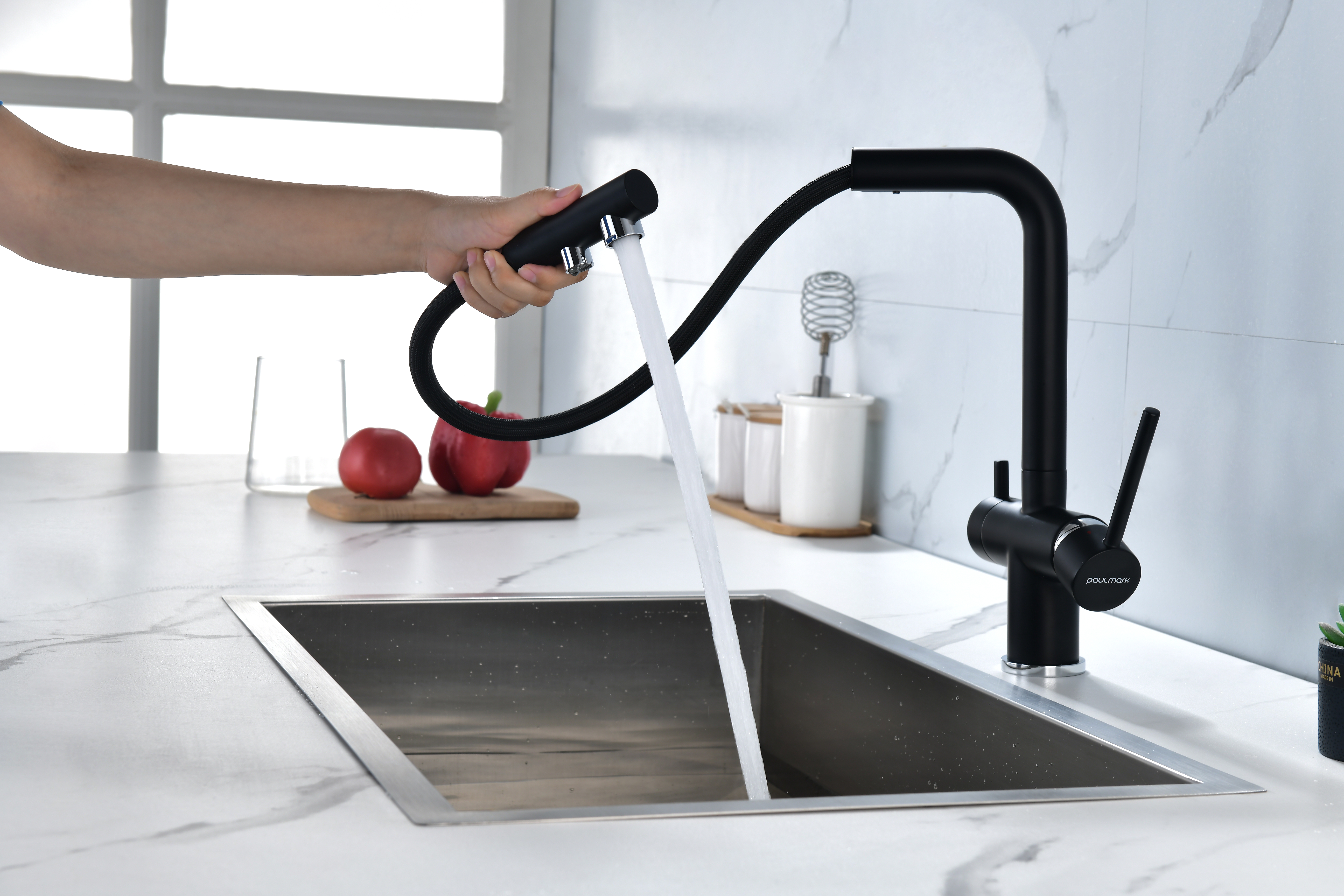 Смеситель оснащен гибким выдвижным изливом из нейлоновой оплетки, которая обладает отличной устойчивостью к истиранию и разрушению. Данная техническая особенность расширяет рабочую зону смесителя, позволяя пользоваться им с удобством в больших мойках, мойках с двумя чашами, или наполнять водой ёмкость на столе рядом с мойкой, в том числе питьевой водой.