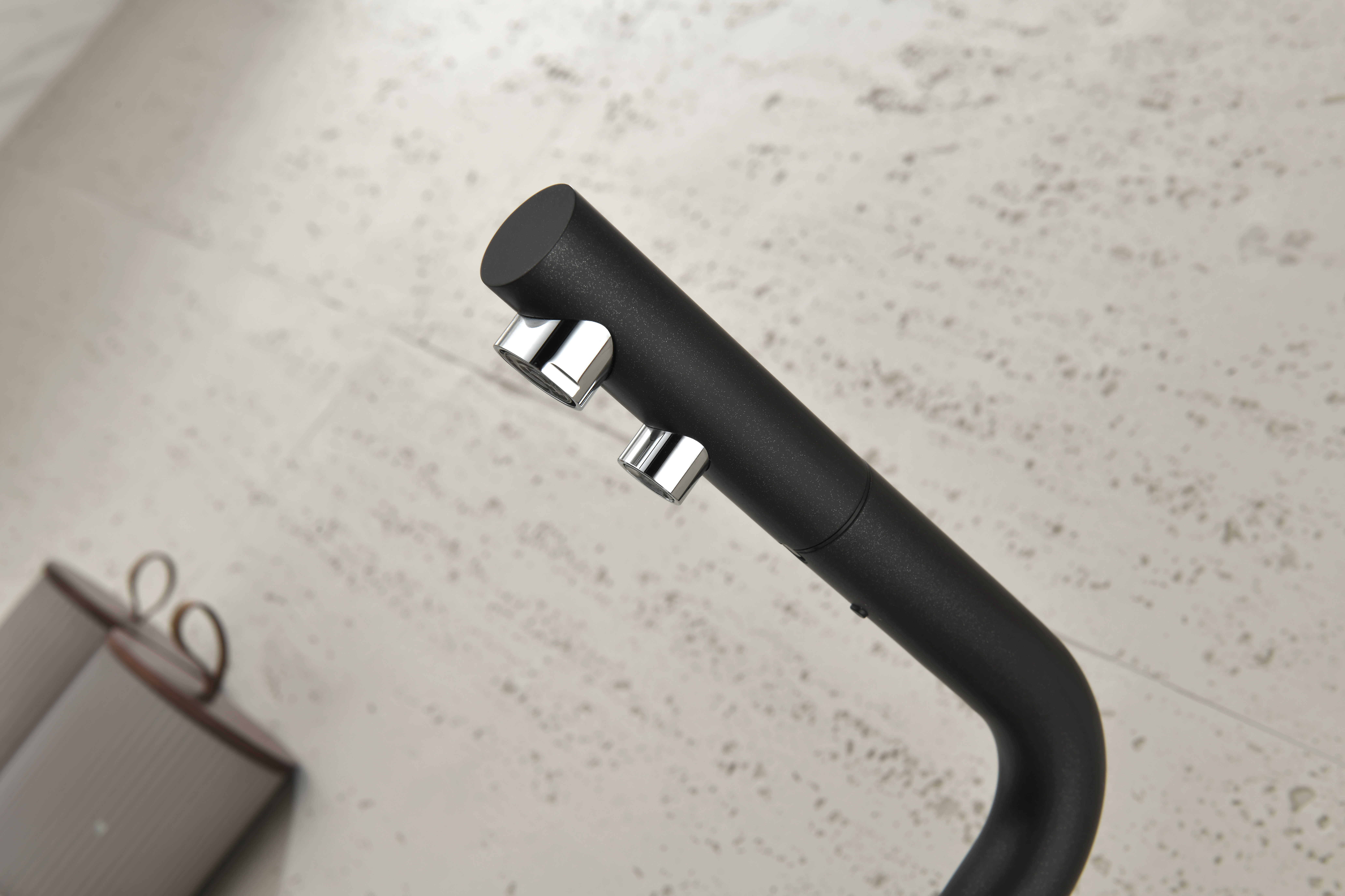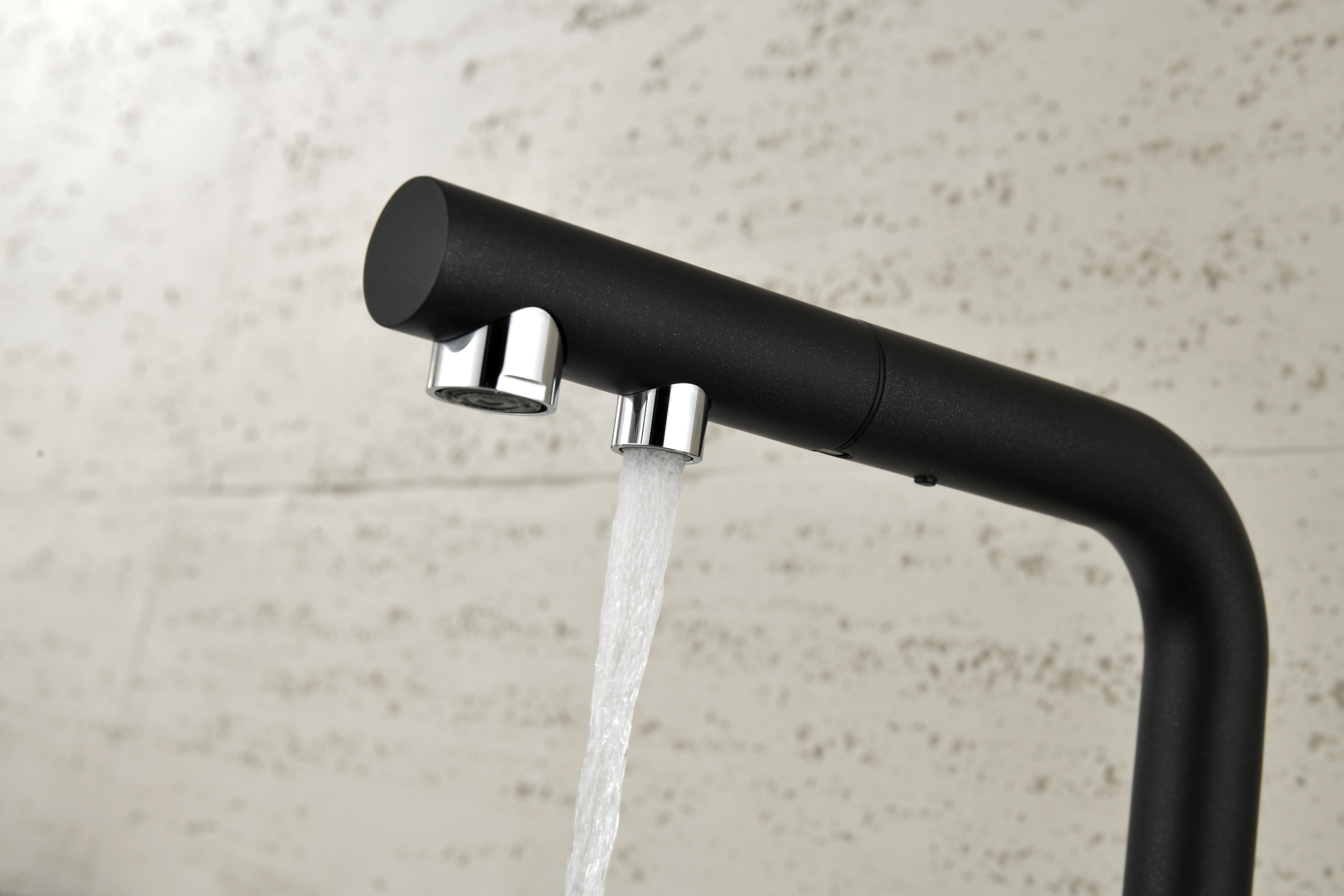 SERPENTINE оснащён функцией TRINKWASSER - излив смесителя имеет встроенный независимый канал для питьевой воды из фильтра, таким образом питьевая и водопроводная вода не смешиваются. Управление питьевой водой осуществляется отдельным рычагом, расположенным слева. Для пуска водопроводной воды используется большой рычаг справа.