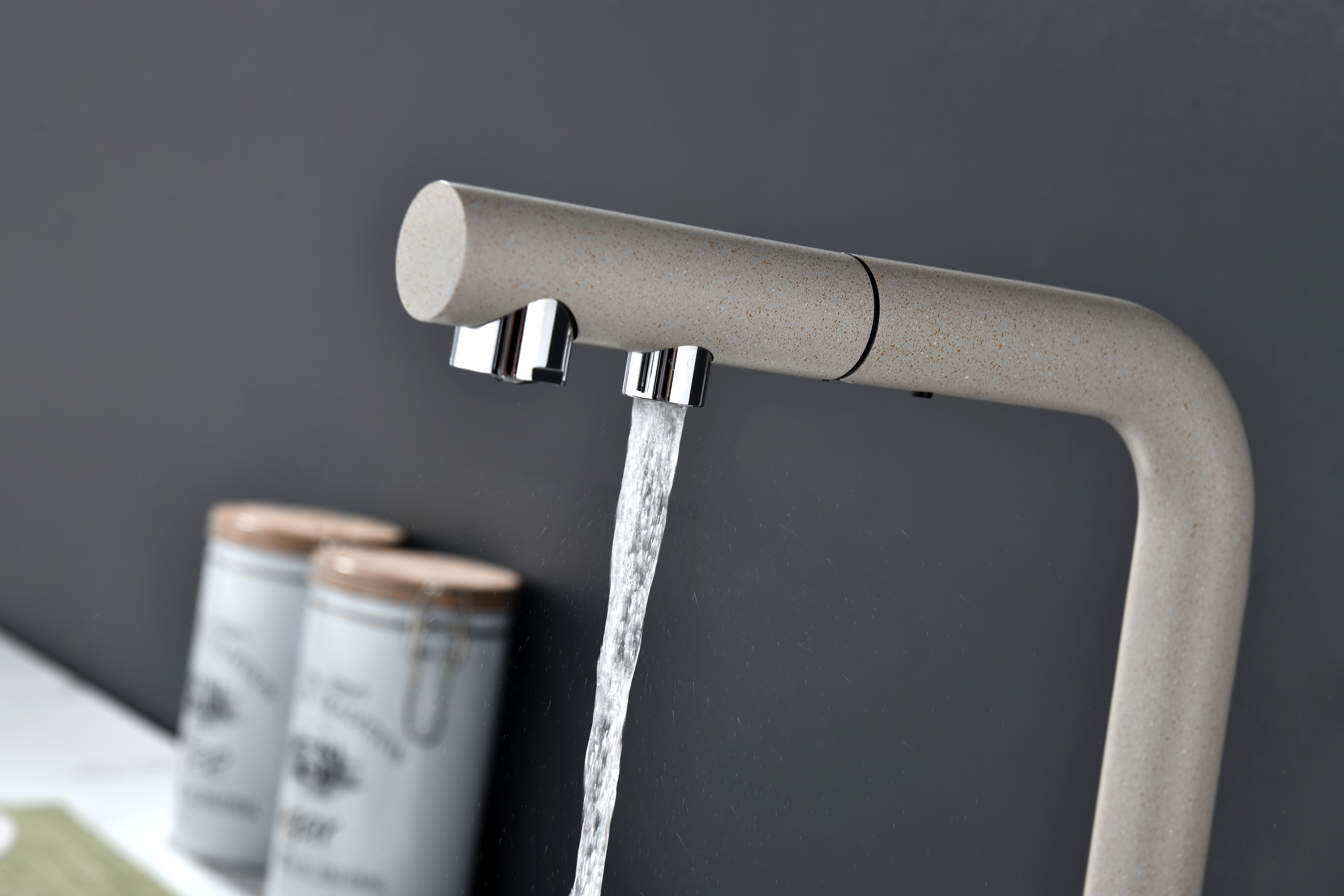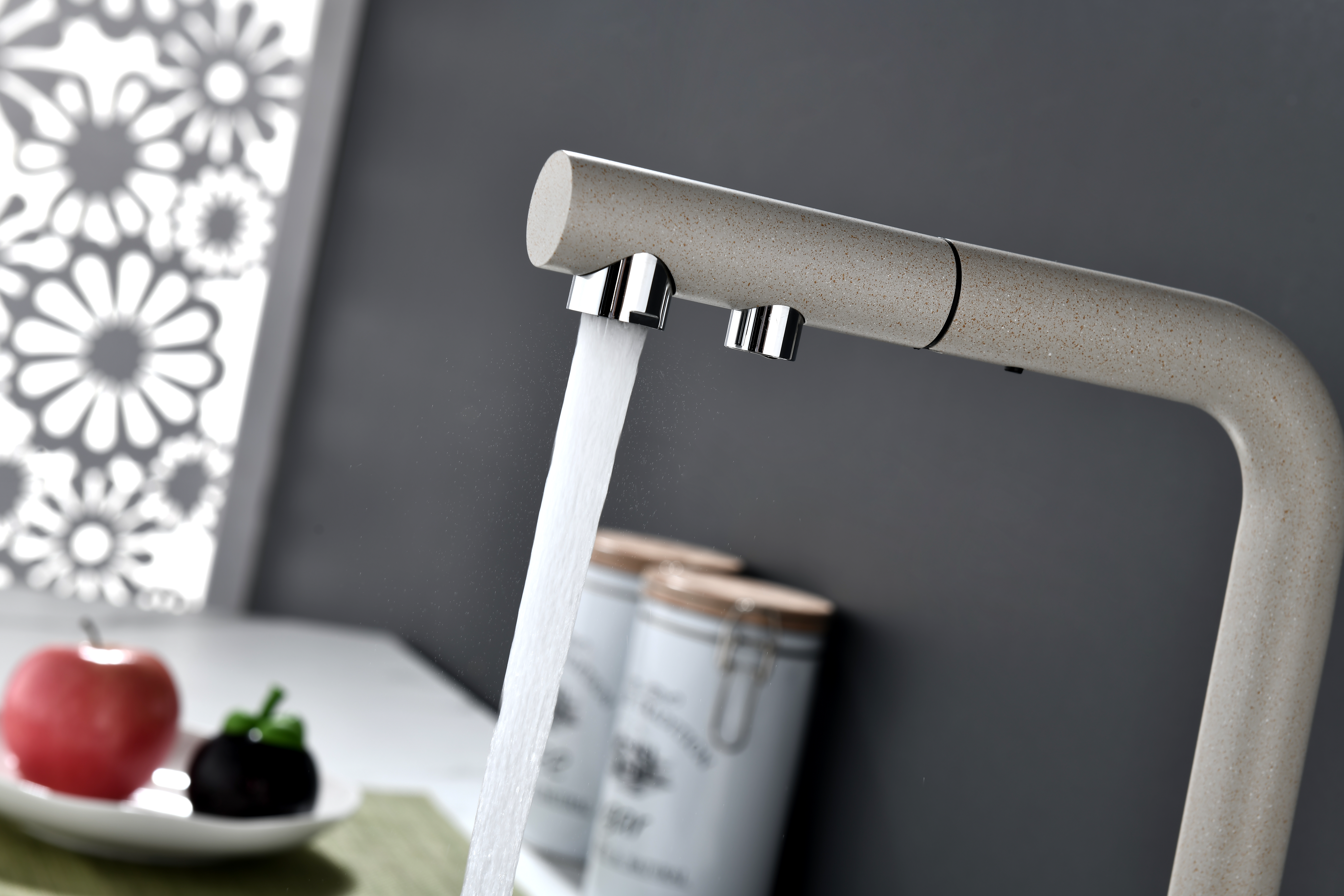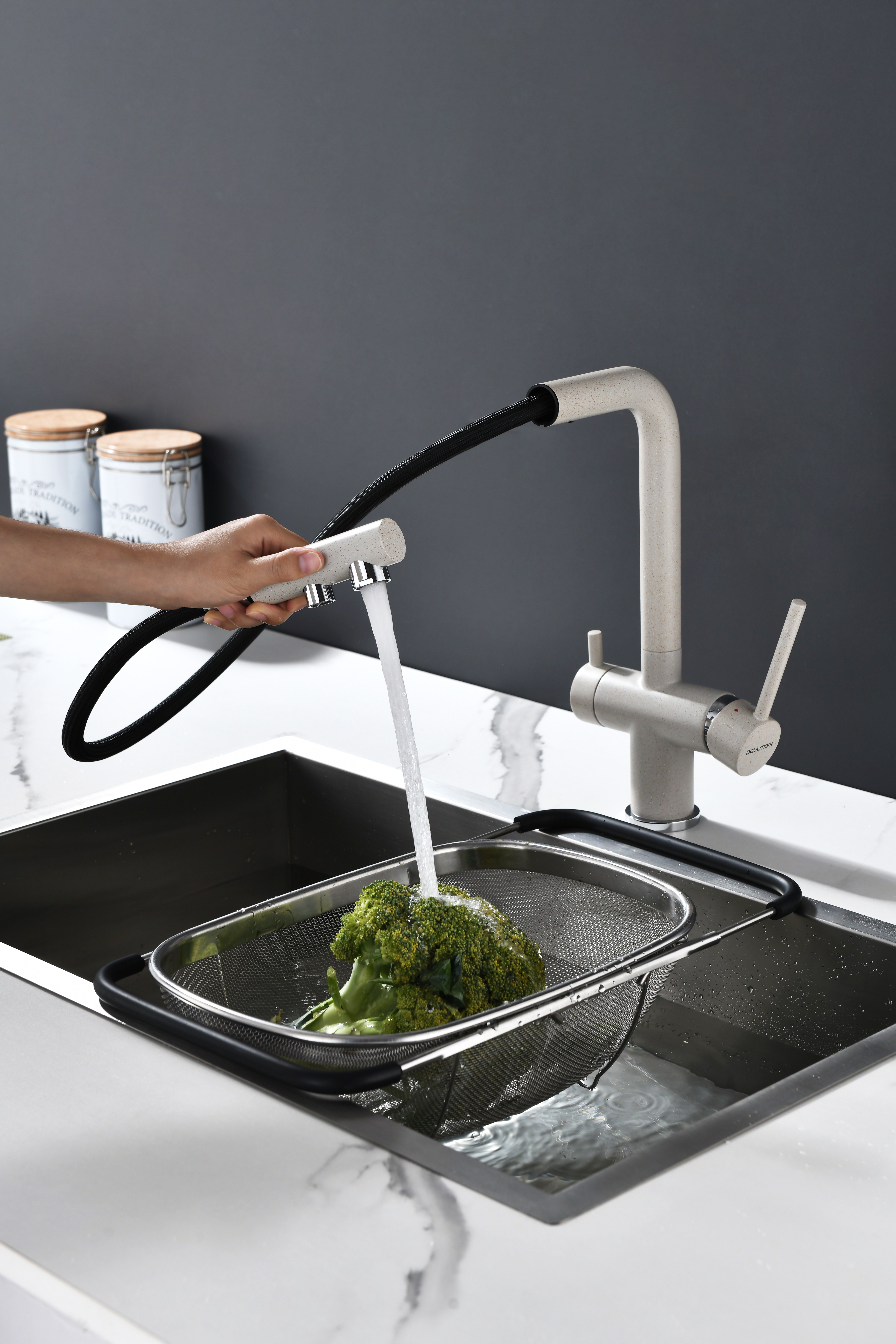Смеситель оснащен гибким выдвижным изливом из нейлоновой оплетки, которая обладает отличной устойчивостью к истиранию и разрушению. Данная техническая особенность расширяет рабочую зону смесителя, позволяя пользоваться им с удобством в больших мойках, мойках с двумя чашами, или наполнять водой ёмкость на столе рядом с мойкой, в том числе питьевой водой.