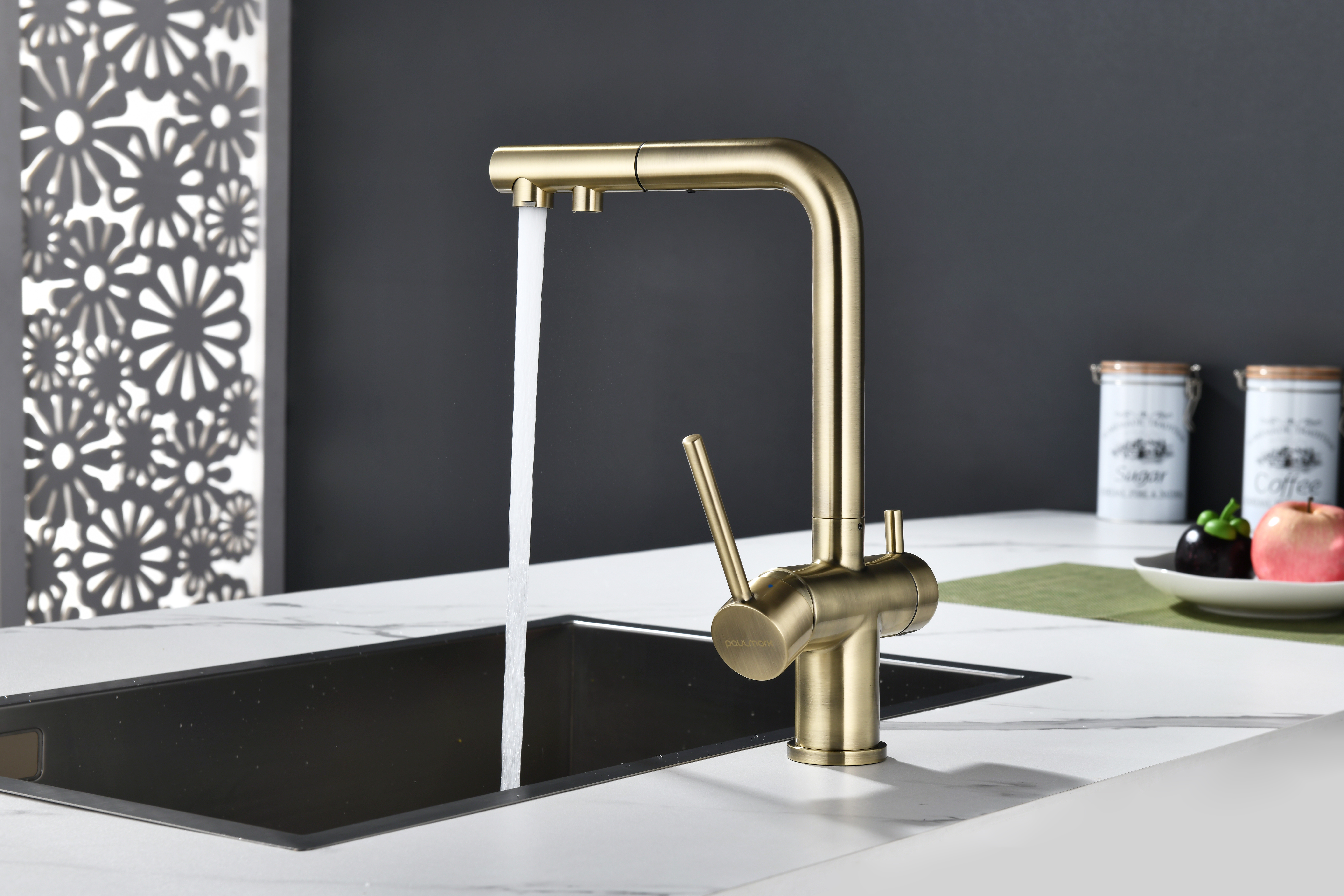 SERPENTINE оснащён функцией TRINKWASSER - излив смесителя имеет встроенный независимый канал для питьевой воды из фильтра, таким образом питьевая и водопроводная вода не смешиваются. Управление питьевой водой осуществляется отдельным рычагом, расположенным слева. Для пуска водопроводной воды используется большой рычаг справа.