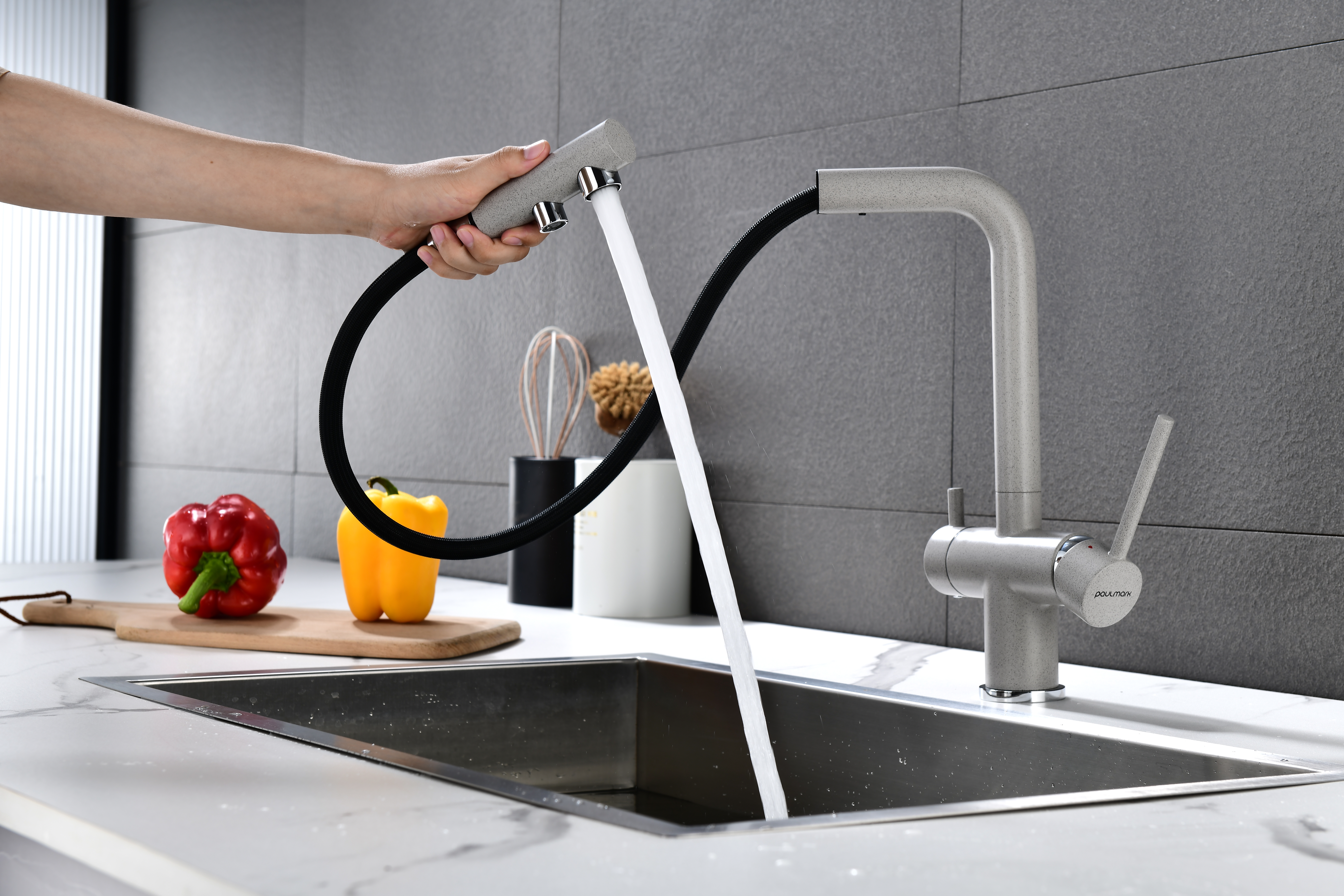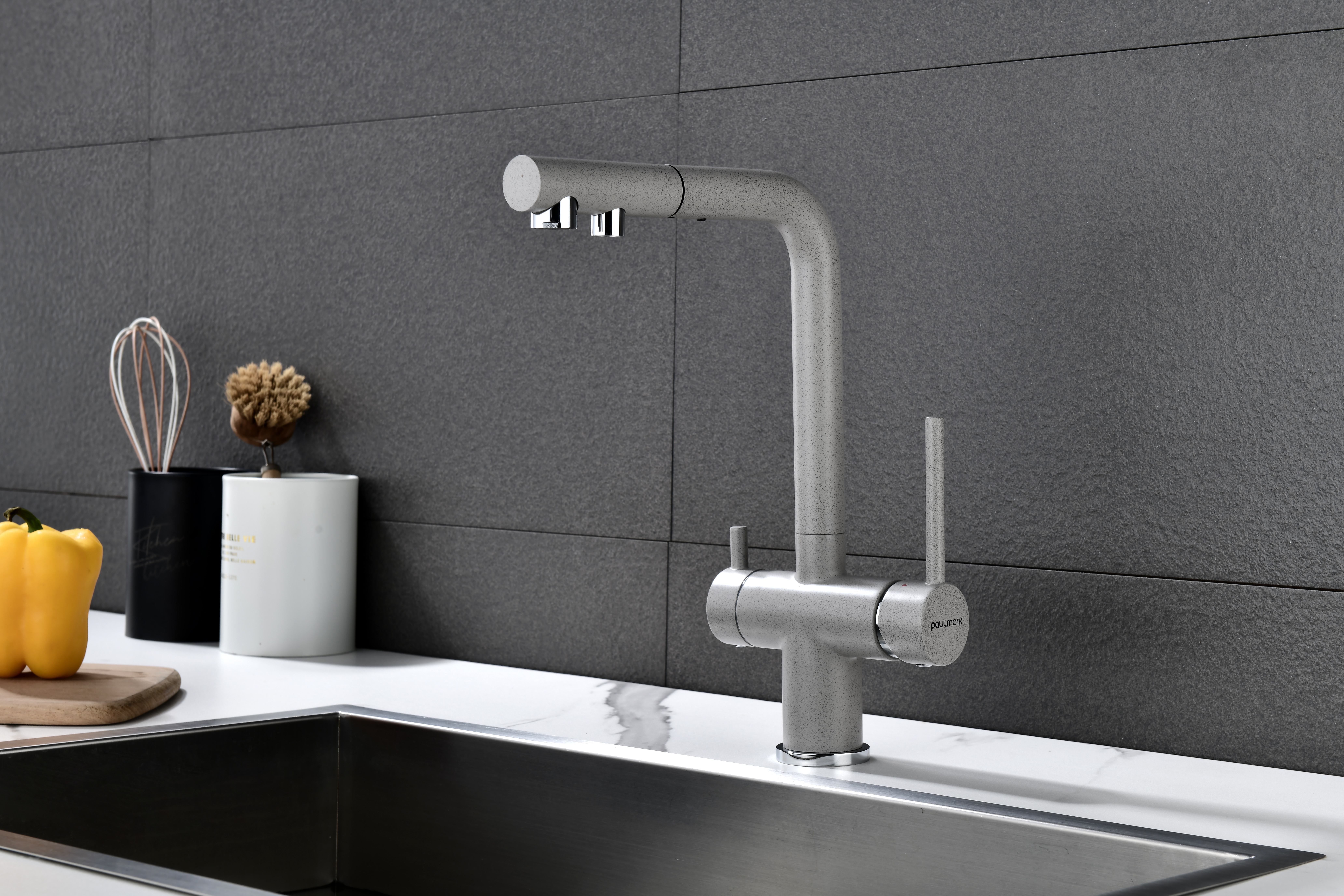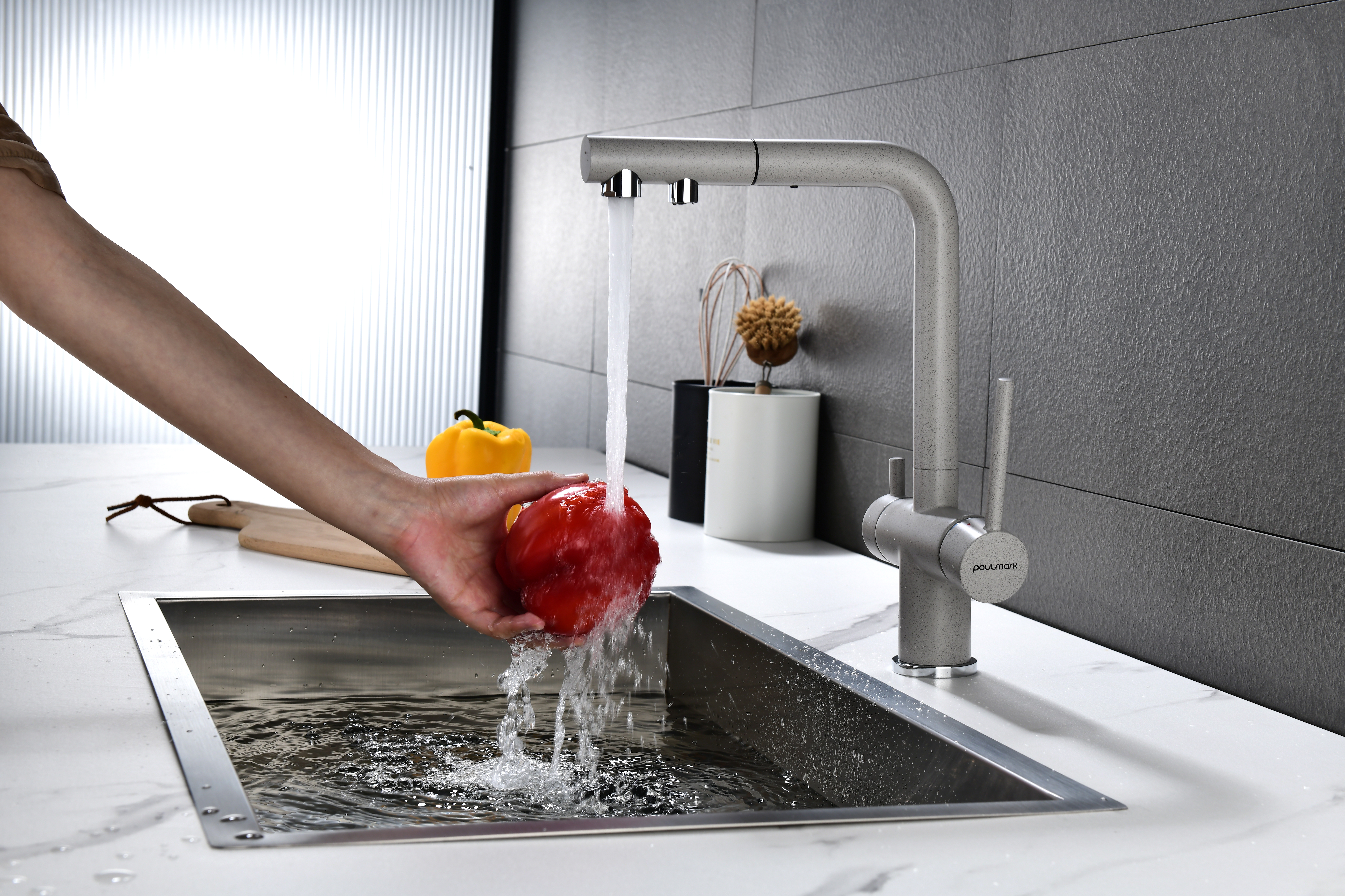 Смеситель оснащен гибким выдвижным изливом из нейлоновой оплетки, которая обладает отличной устойчивостью к истиранию и разрушению. Данная техническая особенность расширяет рабочую зону смесителя, позволяя пользоваться им с удобством в больших мойках, мойках с двумя чашами, или наполнять водой ёмкость на столе рядом с мойкой, в том числе питьевой водой.
