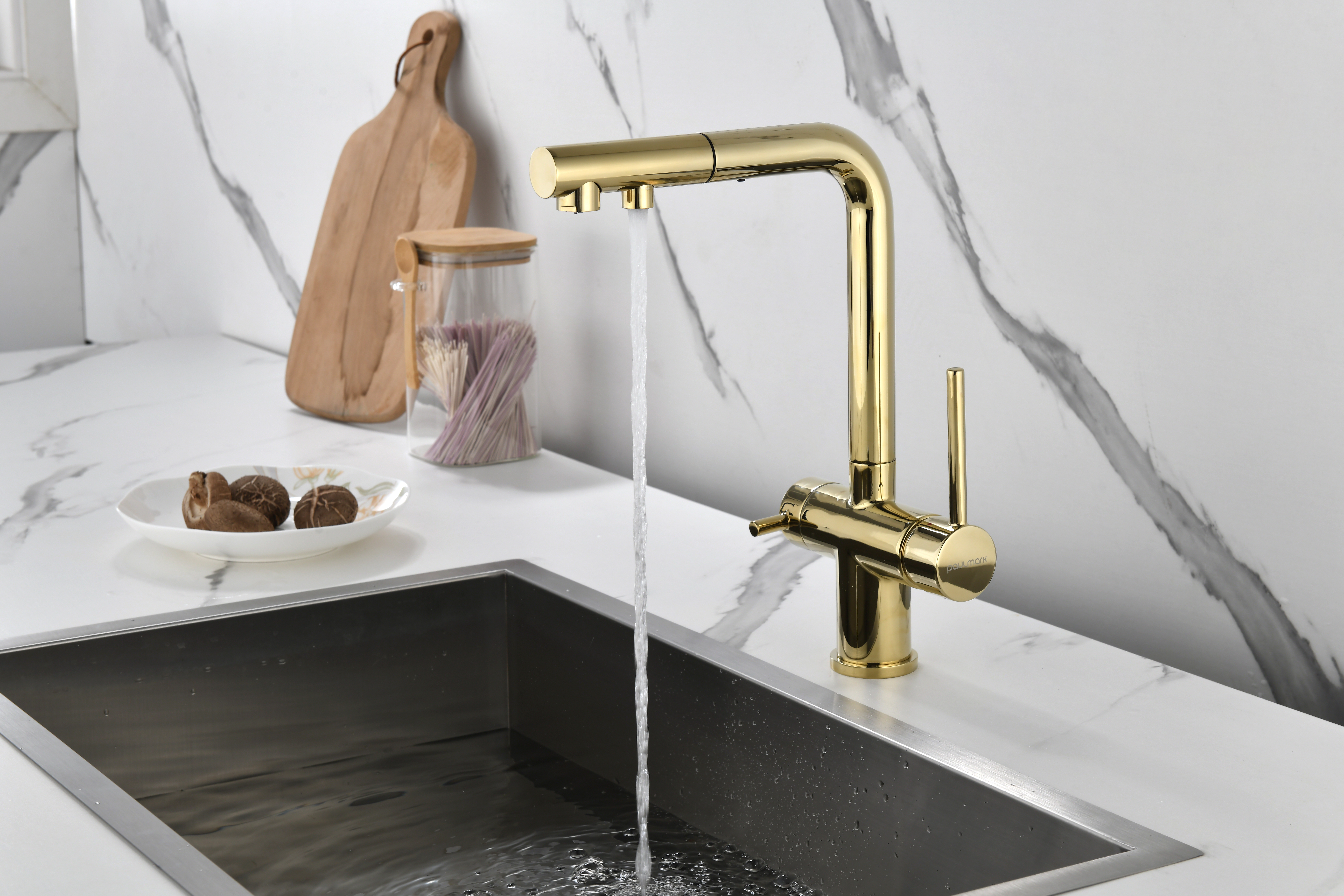 Смеситель оснащен гибким выдвижным изливом из нейлоновой оплетки, которая обладает отличной устойчивостью к истиранию и разрушению. Данная техническая особенность расширяет рабочую зону смесителя, позволяя пользоваться им с удобством в больших мойках, мойках с двумя чашами, или наполнять водой ёмкость на столе рядом с мойкой, в том числе питьевой водой.