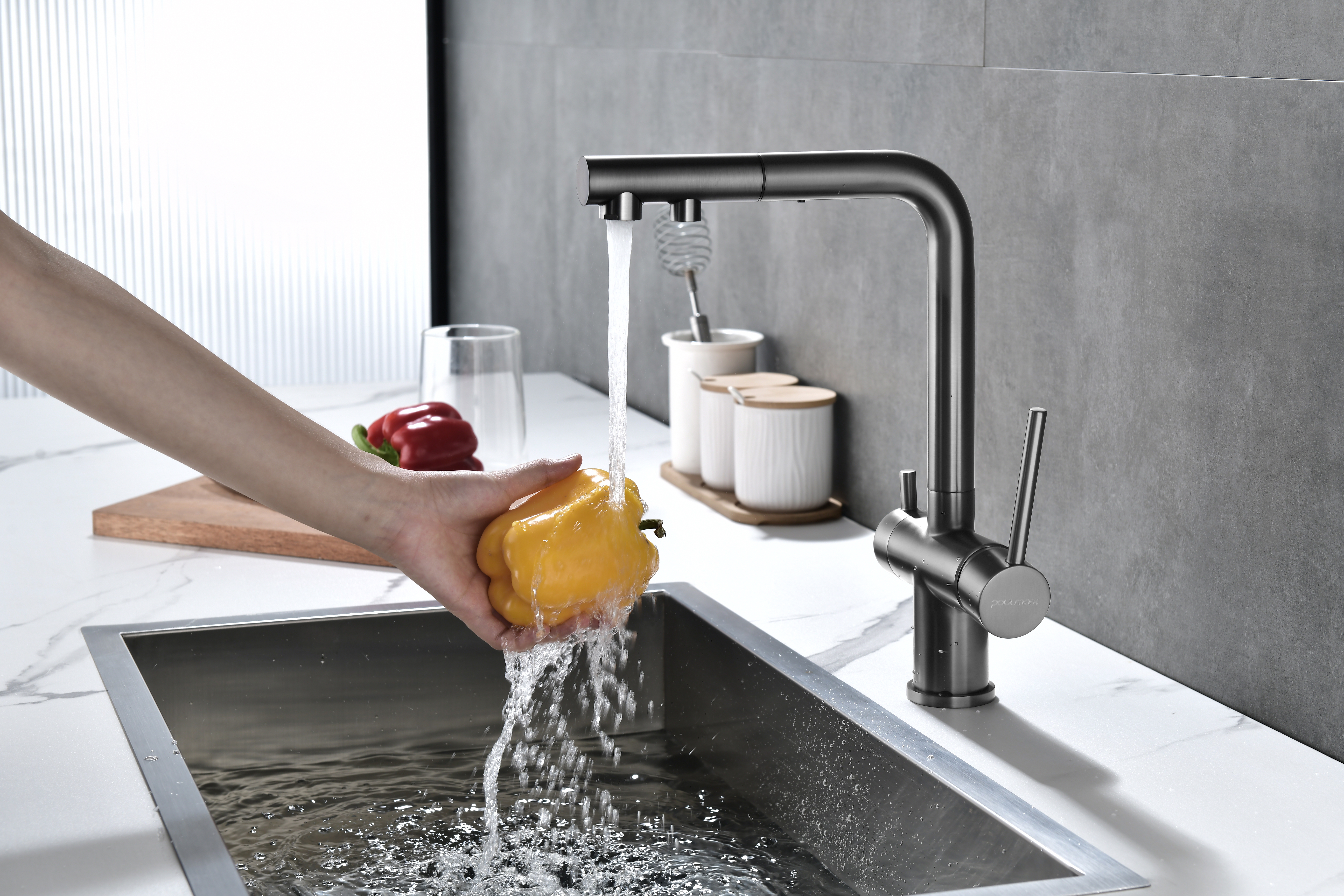 Смеситель оснащен гибким выдвижным изливом из нейлоновой оплетки, которая обладает отличной устойчивостью к истиранию и разрушению. Данная техническая особенность расширяет рабочую зону смесителя, позволяя пользоваться им с удобством в больших мойках, мойках с двумя чашами, или наполнять водой ёмкость на столе рядом с мойкой, в том числе питьевой водой.