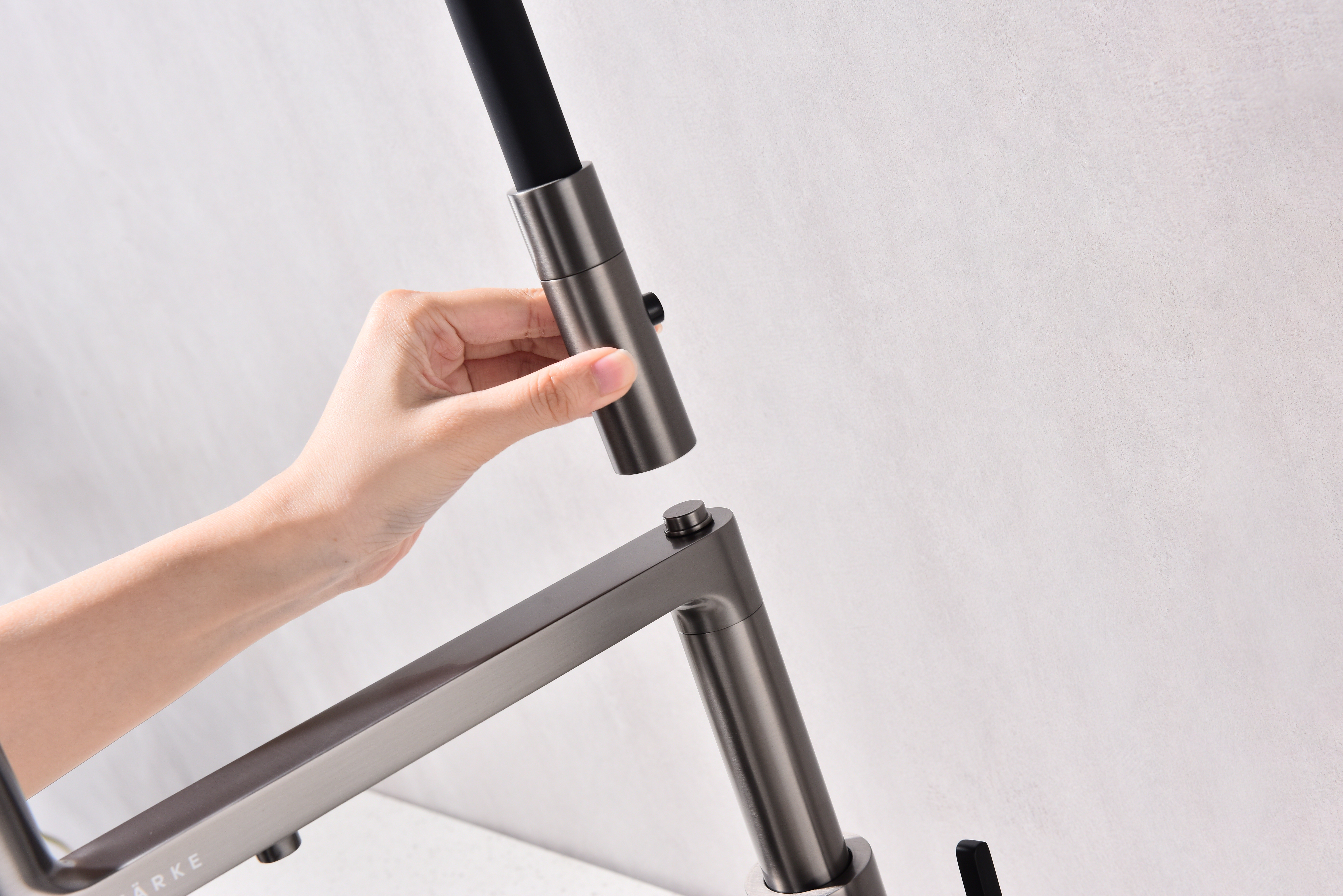 TORNADO оснащён функцией TRINKWASSER – в смесителе присутствует встроенный независимый канал для питьевой воды из фильтра, которая подается из отдельного аэратора на латунной части излива. Водопроводная вода подаётся из гибкого силиконового излива. Управление питьевой водой производится рычагом слева. Рычаг справа управляет подачей водопроводной воды. Совмещение подачи питьевой и водопроводной воды в одном смесителе избавляет от необходимости ставить дополнительный кран и позволяет сделать зону мойки максимально эстетичной.