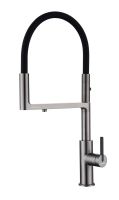 Гибкий силиконовый излив оснащен функцией деликатного душа и магнитным механизмом фиксации в задней части латунного корпуса. Он позволяет ополоснуть посуду или мойку в любой ее части или наполнить емкости даже на столе рядом с мойкой.