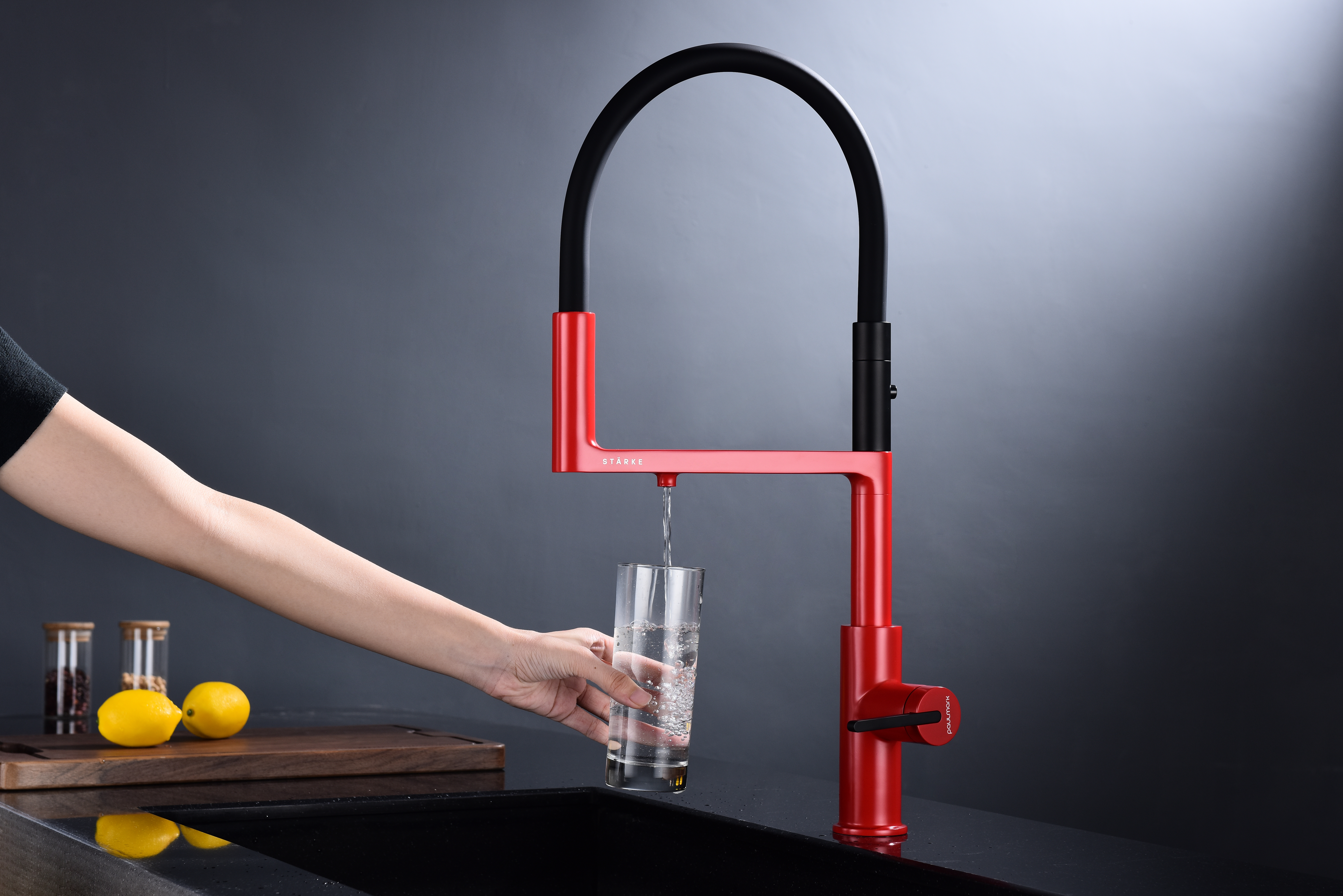 TORNADO оснащён функцией TRINKWASSER – в смесителе присутствует встроенный независимый канал для питьевой воды из фильтра, которая подается из отдельного аэратора на латунной части излива. Водопроводная вода подаётся из гибкого силиконового излива. Управление питьевой водой производится рычагом слева. Рычаг справа управляет подачей водопроводной воды. Совмещение подачи питьевой и водопроводной воды в одном смесителе избавляет от необходимости ставить дополнительный кран и позволяет сделать зону мойки максимально эстетичной.