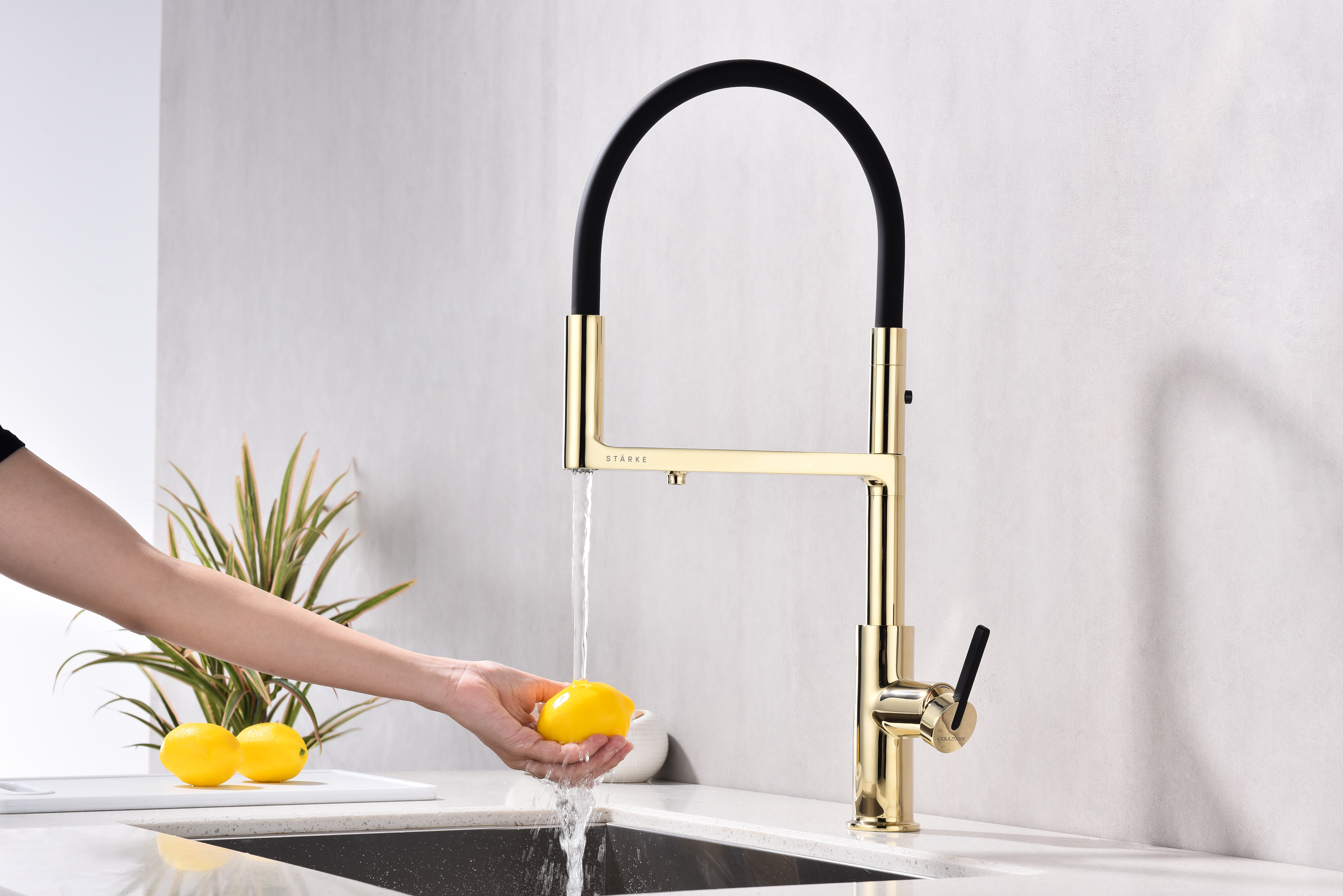 Многофункциональный смеситель для кухни TORNADO – модель премиальной серии «Starke» кухонной сантехники бренда Paulmark изготовлен из высококачественной латуни, которая отвечает высочайшим европейским стандартам качества, не содержит свинца, не разрушается со временем и безопасна для здоровья.