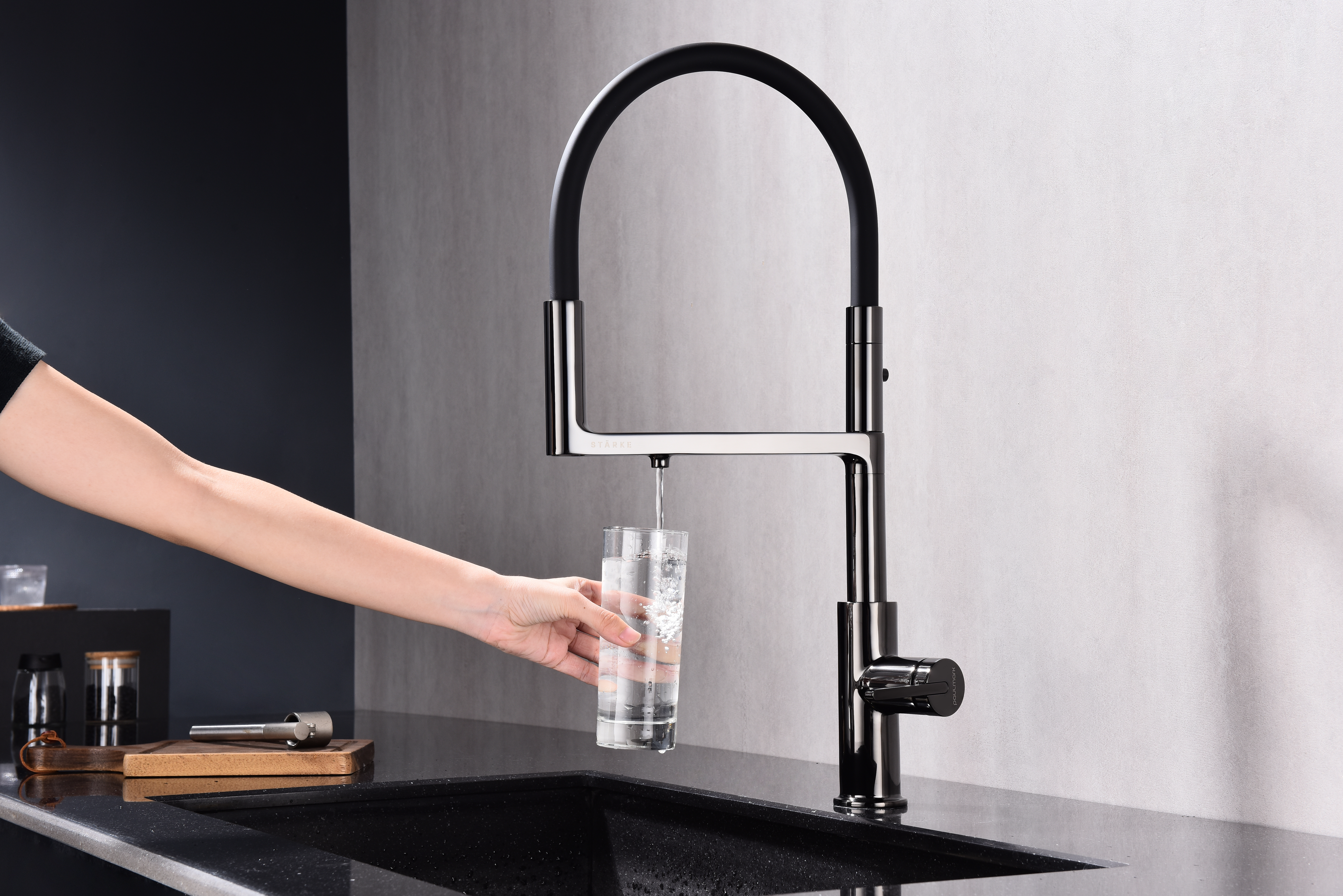 TORNADO оснащён функцией TRINKWASSER – в смесителе присутствует встроенный независимый канал для питьевой воды из фильтра, которая подается из отдельного аэратора на латунной части излива. Водопроводная вода подаётся из гибкого силиконового излива. Управление питьевой водой производится рычагом слева. Рычаг справа управляет подачей водопроводной воды. Совмещение подачи питьевой и водопроводной воды в одном смесителе избавляет от необходимости ставить дополнительный кран и позволяет сделать зону мойки максимально эстетичной.