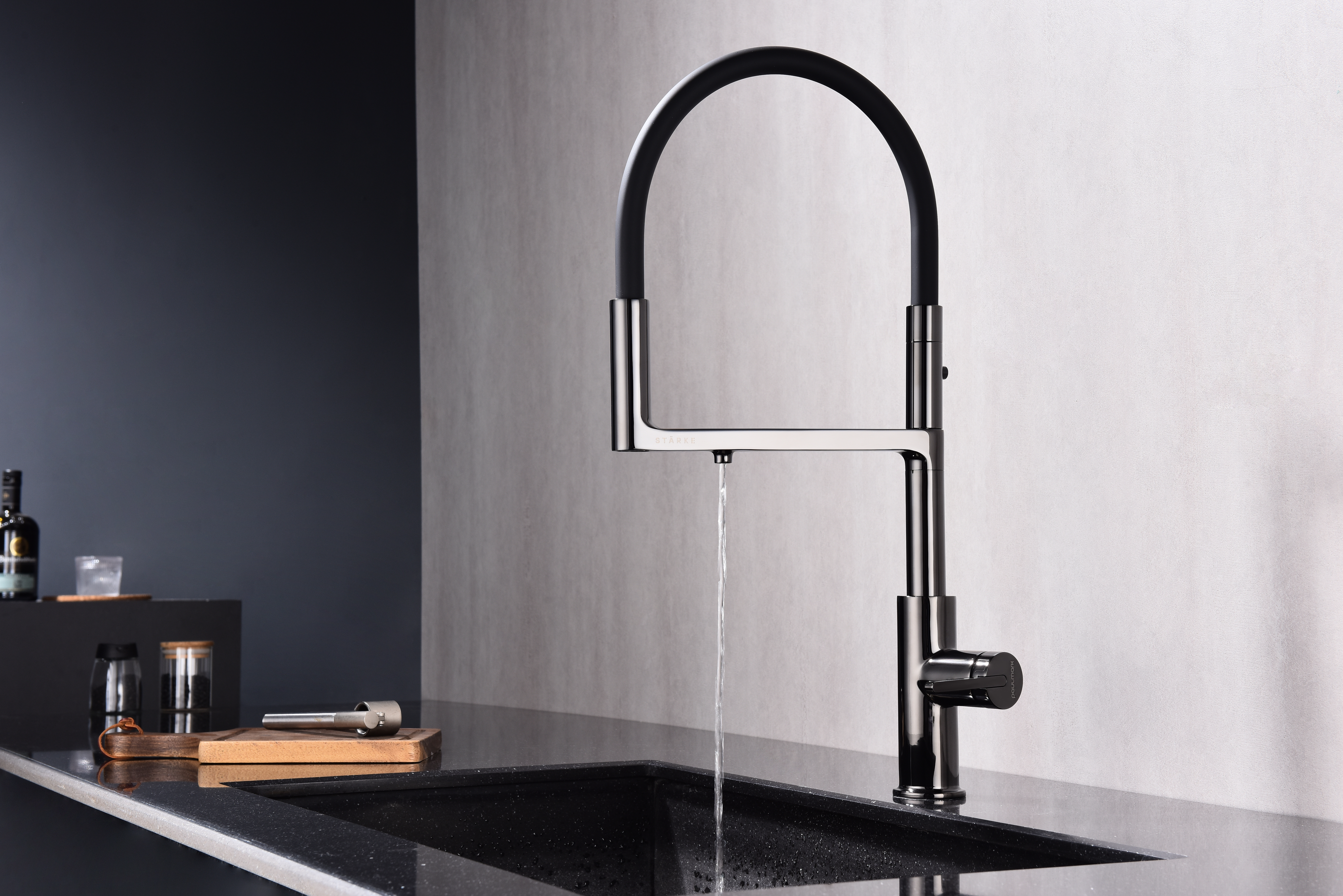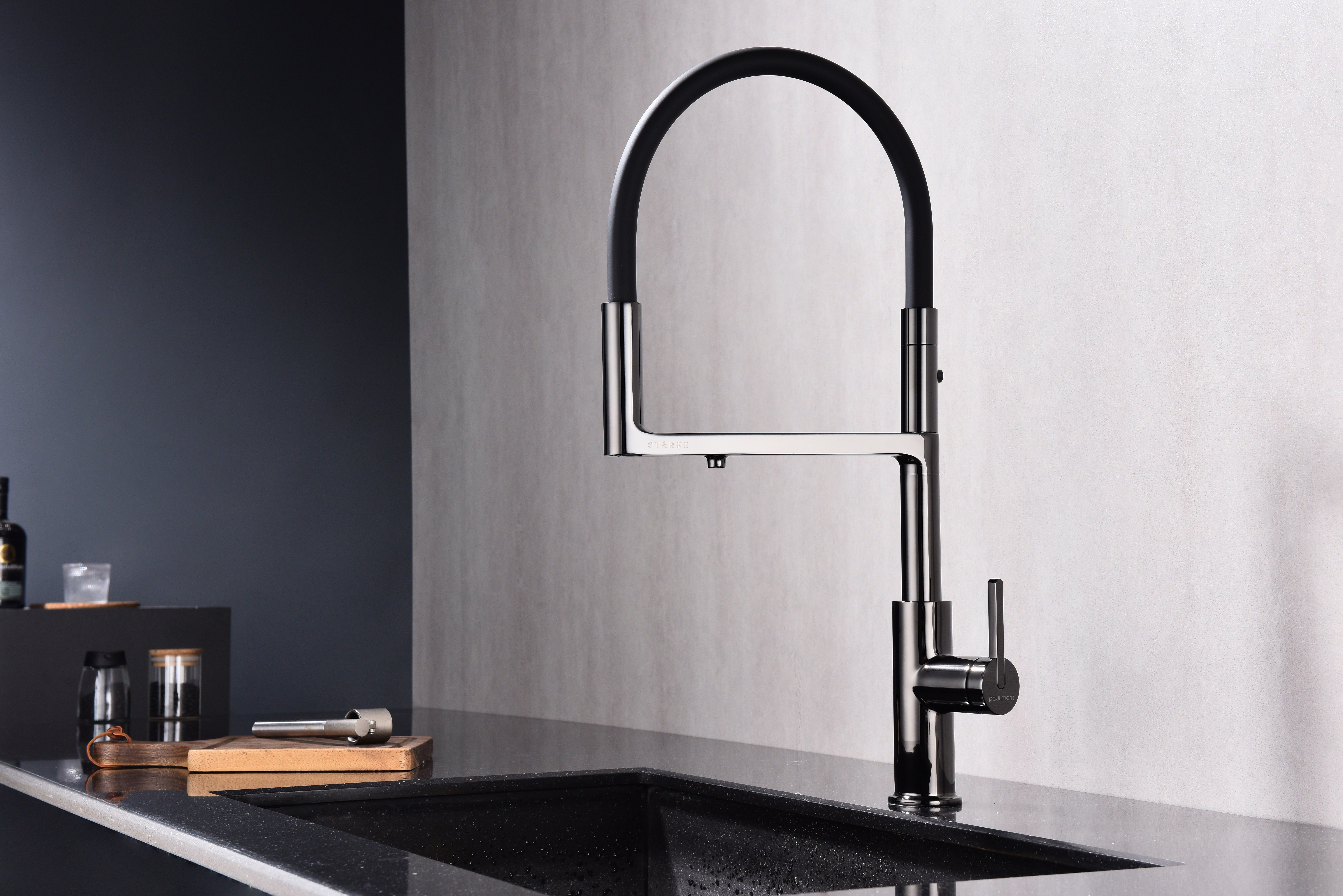 Гибкий силиконовый излив оснащен функцией деликатного душа и магнитным механизмом фиксации в задней части латунного корпуса. Он позволяет ополоснуть посуду или мойку в любой ее части или наполнить емкости даже на столе рядом с мойкой.