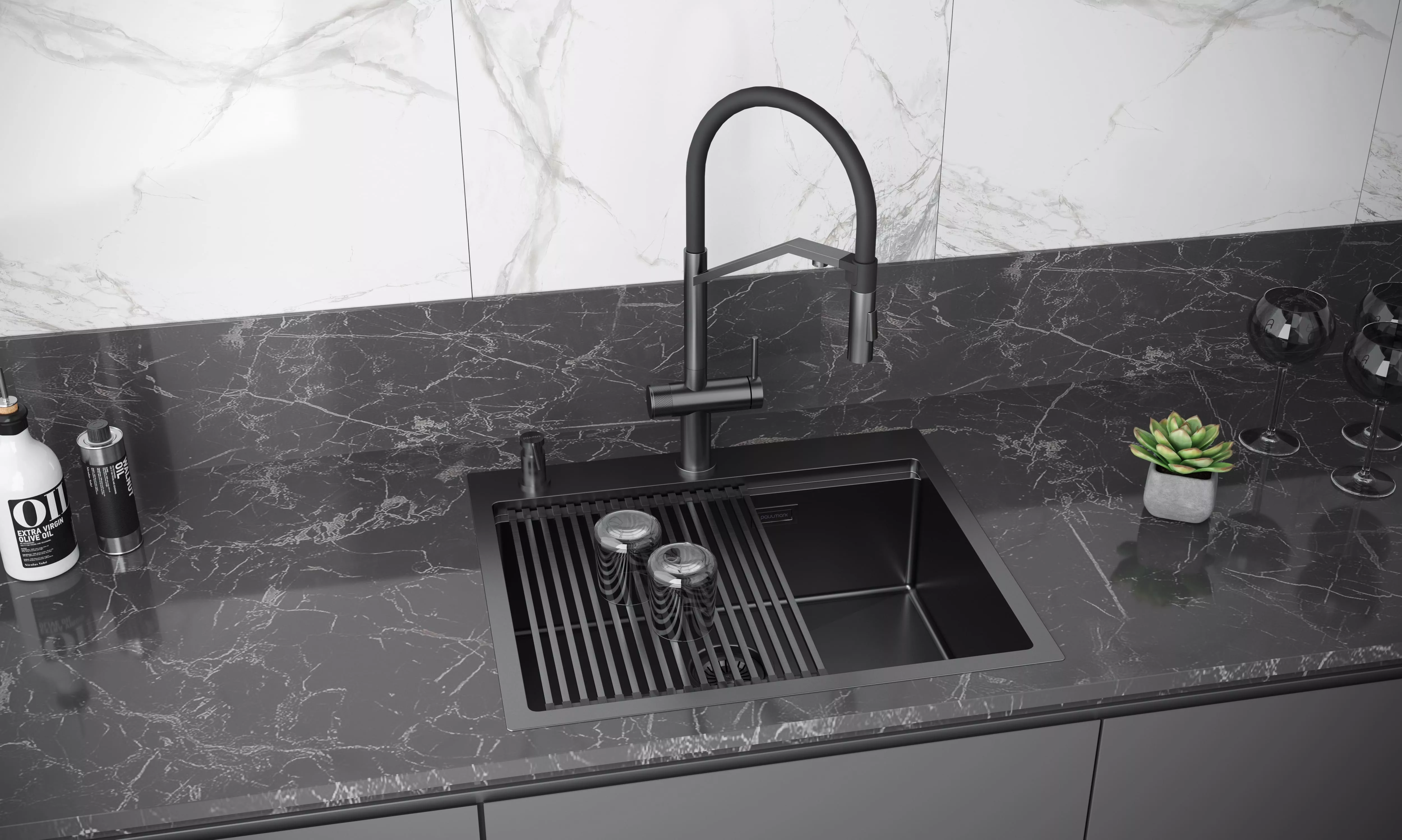 Многофункциональный смеситель для кухни ZENDER оснащен функциями подключения фильтра питьевой воды и гибким силиконовым изливом с двумя режимами подачи водопроводной воды: струя и душ. Для переключения между этими режимами предусмотрена удобная кнопка на конце излива. Управление подачей очищенной питьевой воды осуществляется поворотом специальной ручки, расположенной слева и имеющей декоративные лазерные насечки, при этом вода подается через отдельный аэратор.