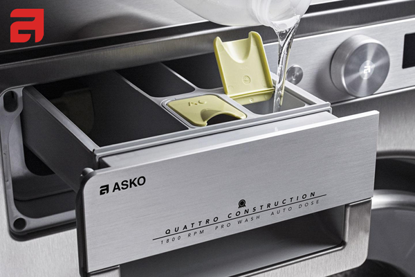 Одной из ключевых инноваций бренда ASKO является система автоматического дозирования Auto Dose. Она оснащена двумя встроенными резервуарами для моющего средства и кондиционера объемом 1,1 литра каждый. Прецизионные насосы самостоятельно подают необходимое количество средств, рассчитывая его на основе веса белья, выбранной программы и типа ткани. Запаса хватает примерно на 27 циклов, а датчики информируют об оставшемся количестве средств.